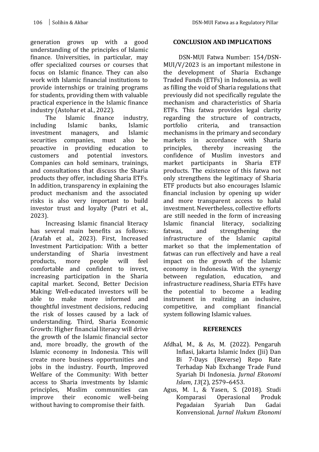 154/DSN-MUI/V/2023 memberikan landasan hukum yang kuat untuk pengembangan ETF Syariah di Indonesia.Fatwa ini tidak hanya memperjelas mekanisme transaksi, tetapi juga meningkatkan kepercayaan investor Muslim dan mendorong pertumbuhan pasar modal Islam.Keberhasilan implementasi fatwa ini sangat bergantung pada peningkatan literasi keuangan dan penguatan infrastruktur pasar Syariah, sehingga ETF Syariah dapat menjadi instrumen investasi yang menarik dan kompetitif, serta berkontribusi pada pertumbuhan ekonomi Islam di Indonesia.