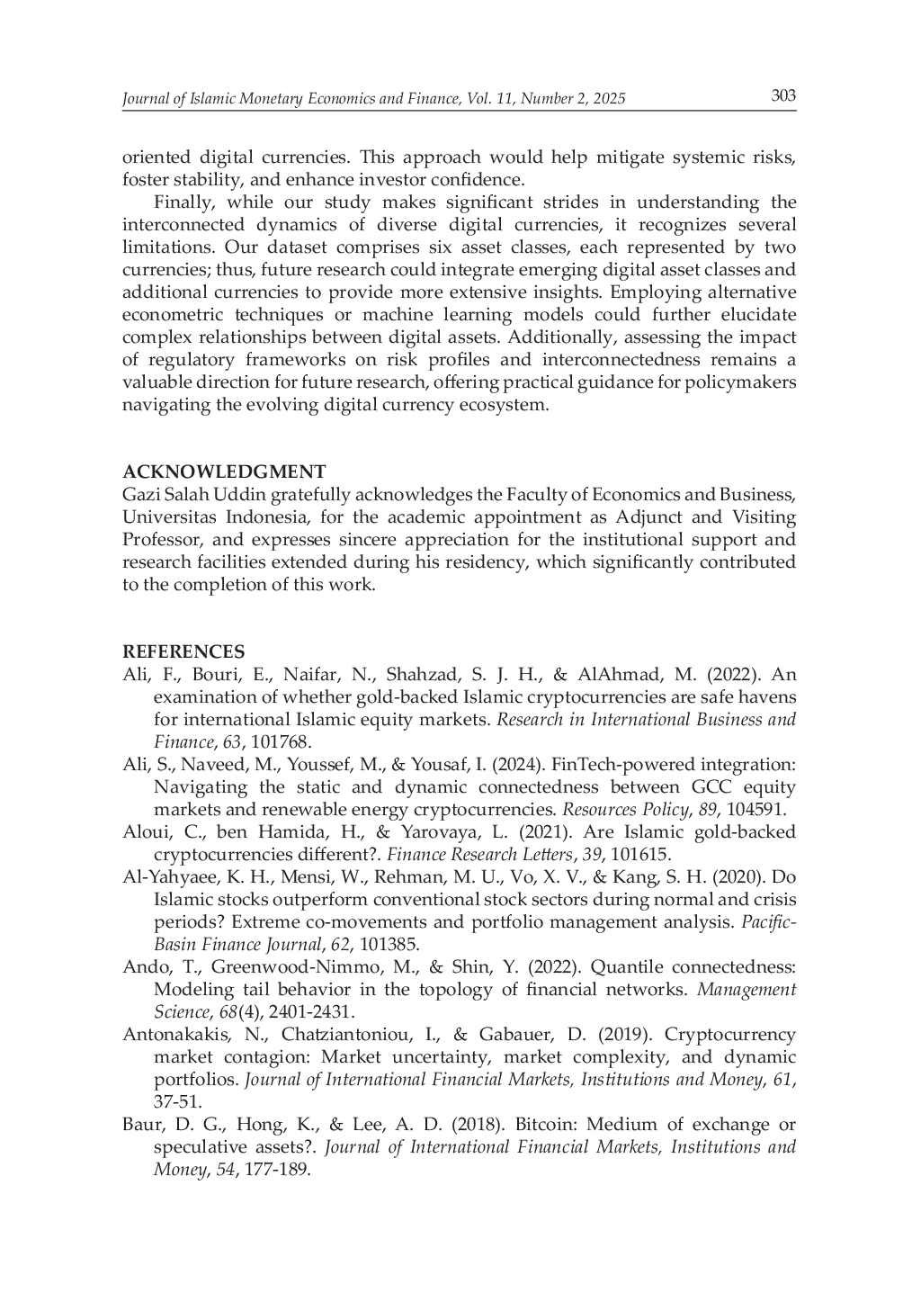 Penelitian lanjutan dapat mendalami lanskap mata uang digital yang terus berkembang dengan memperluas cakupan studi. Penting untuk menginvestigasi bagaimana dinamika risiko dan keterhubungan pasar akan berubah jika studi mencakup lebih banyak jenis mata uang digital yang baru muncul, seperti token yang mewakili aset dunia nyata (RWA) atau mata uang digital yang diterbitkan oleh bank sentral (CBDC), serta menyertakan jumlah aset yang lebih besar dari setiap kategori yang sudah ada. Apakah penambahan variasi aset-aset ini akan mengubah secara signifikan pola limpahan guncangan pasar dan peluang diversifikasi yang ditemukan dalam penelitian ini? Selain itu, mengingat sifat pasar mata uang digital yang sangat dinamis dan kompleks, penggunaan model kecerdasan buatan (AI) dan pembelajaran mesin (machine learning) dapat dieksplorasi lebih jauh. Sejauh mana model-model canggih ini dapat memberikan akurasi yang lebih tinggi dalam memprediksi risiko ekor dan mengidentifikasi pola keterhubungan yang non-linier dibandingkan dengan metode ekonometrik tradisional, terutama dalam memproyeksikan pergerakan pasar ekstrem atau dampak peristiwa tak terduga? Terakhir, dengan temuan bahwa mata uang kripto syariah berbasis emas masih menghadapi tantangan, ada kebutuhan mendesak untuk memahami secara komprehensif dampak spesifik dari berbagai kerangka peraturan. Bagaimana regulasi yang mendukung atau yang justru membatasi, baik di tingkat nasional maupun internasional, memengaruhi profil risiko, tingkat likuiditas, dan pola keterhubungan pasar mata uang digital, khususnya bagi aset yang berorientasi etis seperti kripto syariah dan hijau? Studi komparatif antar yurisdiksi dengan pendekatan regulasi yang berbeda dapat sangat membantu dalam mengidentifikasi praktik terbaik untuk mendorong stabilitas dan meningkatkan kepercayaan investor di ekosistem digital ini.