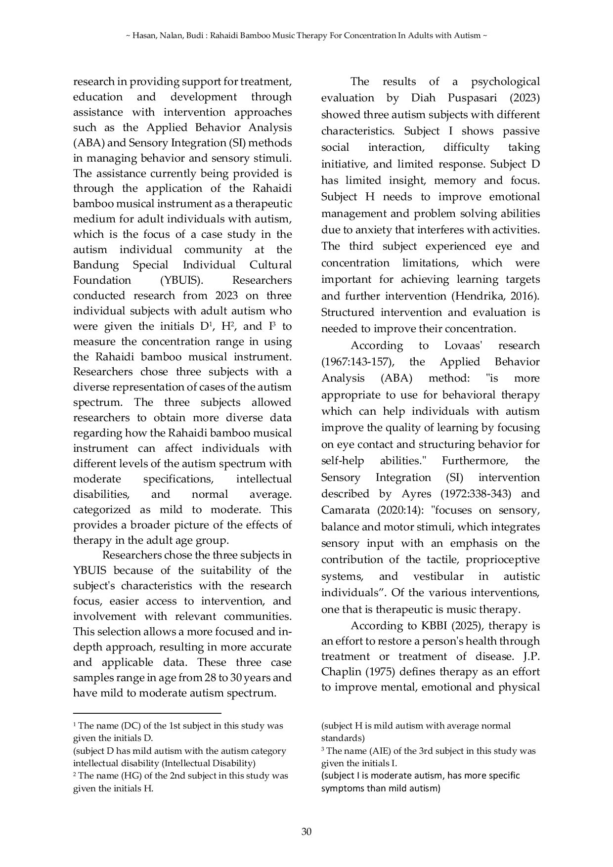 PANTUN: Jurnal Ilmiah Seni BudayaPANTUN: Jurnal Ilmiah Seni BudayaPenelitian ini bertujuan untuk mengungkap efek penggunaan alat musik Rahaidi bambu dalam meningkatkan konsentrasi pada orang dewasa dengan autisme di Yayasan Budaya Individu Spesial (YBUIS) Bandung. Penelitian ini menggunakan metode kualitatif dengan pendekatan penelitian tindakan berdasarkan model Lin S. Norton. Teknik yang digunakan meliputi observasi, wawancara, studi literatur, serta lima langkah penelitian: identifikasi masalah, solusi, implementasi, evaluasi, dan modifikasi. Analisis data dilakukan dengan pendekatan organologi (Sue Carole DeVale) dan teori konsentrasi (Santrock), dengan validasi data melalui model ITDEM yang melibatkan triangulasi dan reduksi data. Hasil penelitian menunjukkan bahwa penggunaan alat musik Rahaidi bambu dapat meningkatkan empat jenis perhatian, yaitu Selective Attention, Sustained Attention, Executive Attention, dan Divided Attention. Prosesnya dibagi menjadi tiga tahap: pemula, menengah, dan lanjut, termasuk penilaian, desain, implementasi terapi, pencatatan, dan evaluasi. Penelitian ini membuktikan adanya peningkatan signifikan dalam semua aspek perhatian pada individu dewasa dengan autisme setelah terapi menggunakan musik Rahaidi bambu. Hasil ini mengonfirmasi bahwa pendekatan yang disesuaikan dengan alat musik dapat menjadi alat terapi efektif dalam mendukung pengembangan konsentrasi pada orang dewasa dengan autisme.