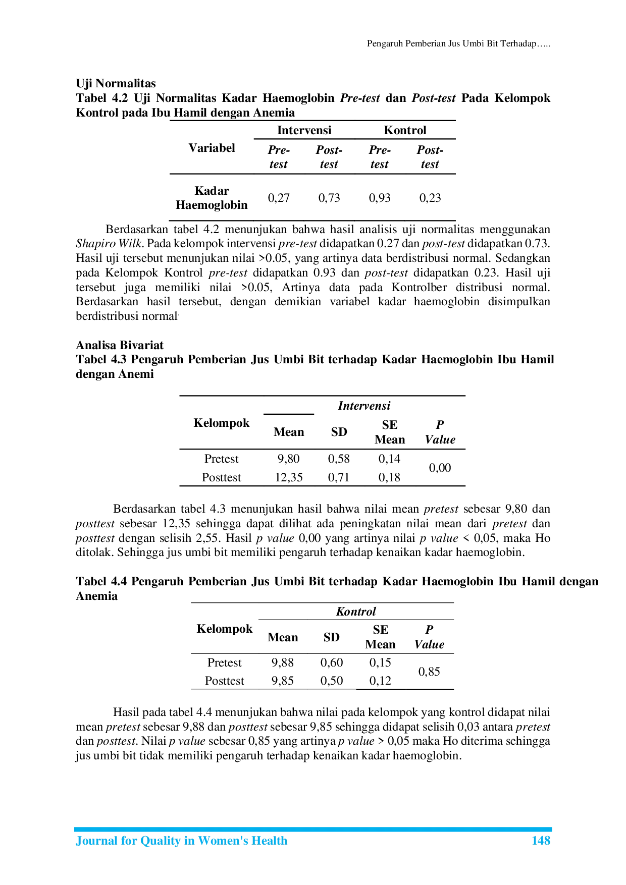 Journal for Quality in Women's HealthJournal for Quality in Women's HealthBerdasarkan hasil data di peroleh, 31% ibu hamil memiliki Hb dibawah 11% di BPM Miftah Wahyudi. Penulis tertarik meninjau pengaruh pemberian Jus Umbi Bit terhadap kenaikan kadar haemoglobin pada ibu hamil dengan anemia. Tujuan penelitian ini untuk mengetahui pengaruh pemberian jus umbi bit terhadap kenaikan kadar haemoglobin pada ibu hamil dengan anemia di BPM Miftah Wahyudi. Dalam penelitian ini menggunakan quasy experimental dengan rancangan two group pretest-posttest with contol group design. Diperoleh nilai selisih mean pretest pada kelompok intervensi dan tidak intervensi -0,08. Diperoleh nilai selisih mean pretest dan posttest pada kelompok intervensi 2,55. Pada pretest dan posttest kelompok tidak intervensi 0,03. Pada posttest kelompok intervensi dan tidak intervensi didapat selisih nilai mean 0,71. Kelompok tidak intervensi dan intervensi posttest menunjukkan bahwa nilai p value 0,00. Kelompok intervensi pretest dan posttest nilai p value 0,00. Kelompok tidak intervensi pretest dan posttest nilai p value 0,85. Ada pengaruh pemberian jus umbi bit terhadap kenaikan kadar haemoglobin pada ibu hamil dengan anemia. Saran untuk tempat peneliti diharapkan menyelenggarakan penyuluhan atau pendidikan kesehatan tentang pemanfaatan umbi bit untuk pemenuhan kebutuhan zat besi.