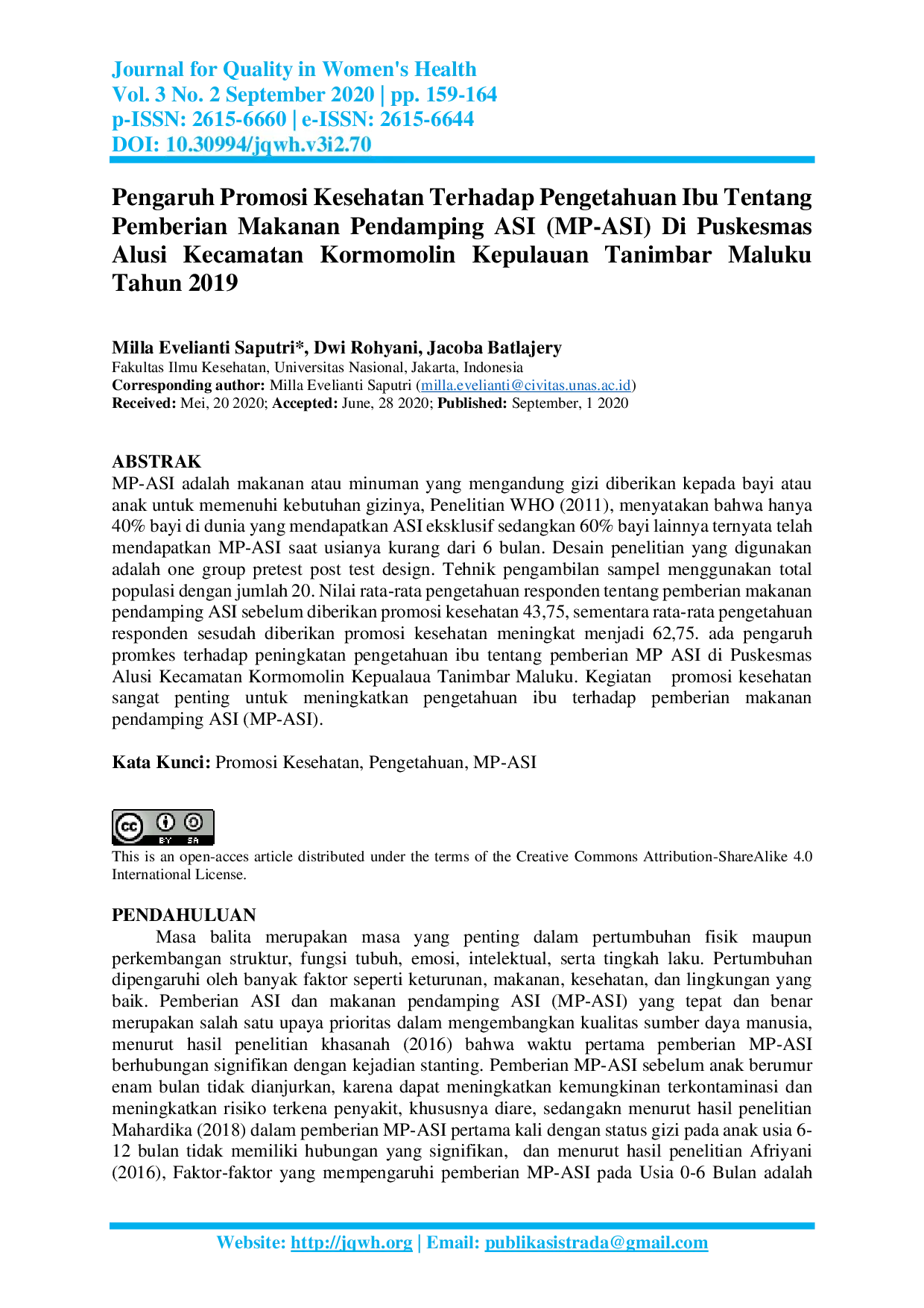 Journal for Quality in Women's HealthJournal for Quality in Women's HealthMP-ASI adalah makanan atau minuman yang mengandung gizi diberikan kepada bayi atau anak untuk memenuhi kebutuhan gizinya. Penelitian WHO (2011) menyatakan bahwa hanya 40% bayi di dunia yang mendapatkan ASI eksklusif sedangkan 60% bayi lainnya ternyata telah mendapatkan MP-ASI saat usianya kurang dari 6 bulan. Desain penelitian yang digunakan adalah one group pretest post test design. Tehnik pengambilan sampel menggunakan total populasi dengan jumlah 20. Nilai rata-rata pengetahuan responden tentang pemberian makanan pendamping ASI sebelum diberikan promosi kesehatan 43,75, sementara rata-rata pengetahuan responden sesudah diberikan promosi kesehatan meningkat menjadi 62,75. ada pengaruh promkes terhadap peningkatan pengetahuan ibu tentang pemberian MP ASI di Puskesmas Alusi Kecamatan Kormomolin Kepualaua Tanimbar Maluku. Kegiatan promosi kesehatan sangat penting untuk meningkatkan pengetahuan terhadap pemberian makanan pendamping ASI (MP-ASI).