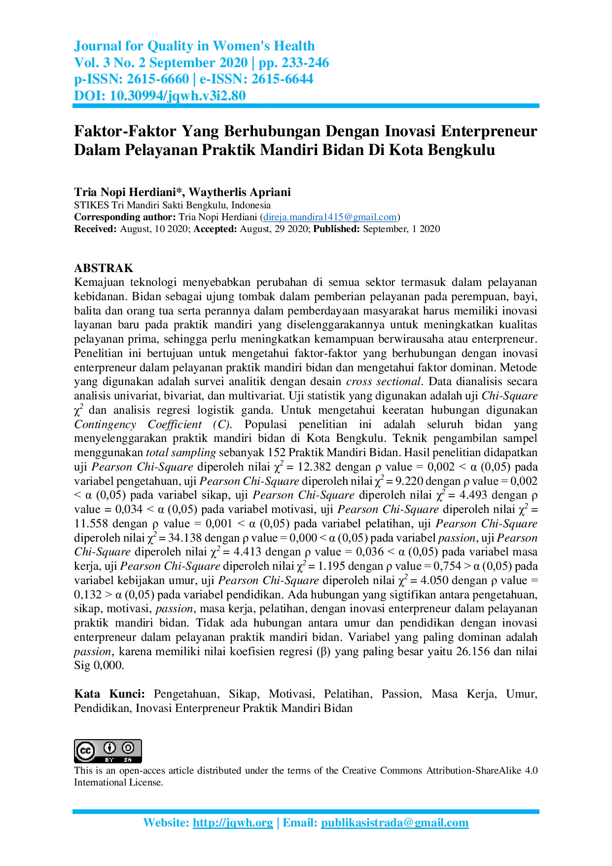 Journal for Quality in Women's HealthJournal for Quality in Women's HealthKemajuan teknologi menyebabkan perubahan di semua sektor termasuk dalam pelayanan kebidanan. Bidan sebagai ujung tombak dalam pemberian pelayanan pada perempuan, bayi, balita dan orang tua serta perannya dalam pemberdayaan masyarakat harus memiliki inovasi layanan baru pada praktik mandiri yang diselenggarakannya untuk meningkatkan kualitas pelayanan prima, sehingga perlu meningkatkan kemampuan berwirausaha atau enterpreneur. Penelitian ini bertujuan untuk mengetahui faktor-faktor yang berhubungan dengan inovasi enterpreneur dalam pelayanan praktik mandiri bidan dan mengetahui faktor dominan. Metode yang digunakan adalah survei analitik dengan desain cross sectional. Data dianalisis secara analisis univariat, bivariat, dan multivariat. Uji statistik yang digunakan adalah uji Chi-Square χ2 dan analisis regresi logistik ganda. Untuk mengetahui keeratan hubungan digunakan Contingency Coefficient. Populasi penelitian adalah seluruh bidan yang menyelenggarakan praktik mandiri bidan di Kota Bengkulu. Teknik pengambilan sampel menggunakan total sampling sebanyak 152 Praktik Mandiri Bidan. Hasil penelitian didapatkan uji Pearson Chi-Square diperoleh nilai χ2 = 12.382 dengan ρ value = 0,002 < α (0,05) pada variabel pengetahuan, uji Pearson Chi-Square diperoleh nilai χ2 = 9.220 dengan ρ value = 0,002 < α (0,05) pada variabel sikap, uji Pearson Chi-Square diperoleh nilai χ2 = 4.493 dengan ρ value = 0,034 < α (0,05) pada variabel motivasi, uji Pearson Chi-Square diperoleh nilai χ2 = 11.558 dengan ρ value = 0,001 < α (0,05) pada variabel pelatihan, uji Pearson Chi-Square diperoleh nilai χ2 = 34.138 dengan ρ value = 0,000 < α (0,05) pada variabel passion, uji Pearson Chi-Square diperoleh nilai χ2 = 4.413 dengan ρ value = 0,036 < α (0,05) pada variabel masa kerja, uji Pearson Chi-Square diperoleh nilai χ2 = 1.195 dengan ρ value = 0,754 > α (0,05) pada variabel kebijakan umur, uji Pearson Chi-Square diperoleh nilai χ2 = 4.050 dengan ρ value = 0,132 > α (0,05) pada variabel pendidikan. Ada hubungan yang sigtifikan antara pengetahuan, sikap, motivasi, passion, masa kerja, pelatihan, dengan inovasi enterpreneur dalam pelayanan praktik mandiri bidan. Tidak ada hubungan antara umur dan pendidikan dengan inovasi enterpreneur dalam pelayanan praktik mandiri bidan. Variabel yang paling dominan adalah passion, karena memiliki nilai koefisien regresi (β) yang paling besar yaitu 26.156 dan nilai Sig 0,000.