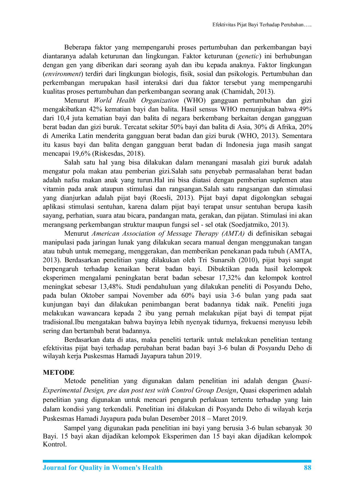 Journal for Quality in Women's HealthJournal for Quality in Women's HealthBerdasarkan data Dinas Kesehatan Provinsi Papua tahun 2017, masalah gizi buruk pada bayi dan balita berusia 0-23 bulan mencapai 3,1%. Stimulasi pada masa bayi sangat penting untuk mencapai pertumbuhan yang optimal. Penelitian ini menggunakan metode Quasi-Experimental Design dengan pre dan post test serta Control Group Design. Sampel penelitian terdiri dari 30 bayi berusia 3-6 bulan, dengan 15 bayi sebagai kelompok eksperimen dan 15 bayi sebagai kelompok kontrol. Data dianalisis menggunakan uji Paired sample t-test. Hasil penelitian menunjukkan bahwa pijat bayi berpengaruh terhadap perubahan berat badan bayi berusia 3-6 bulan (P value = 0,000), yang berarti P value < ɑ. Hal ini menunjukkan bahwa pijat bayi dapat menjadi intervensi dalam mengoptimalkan pertumbuhan anak.