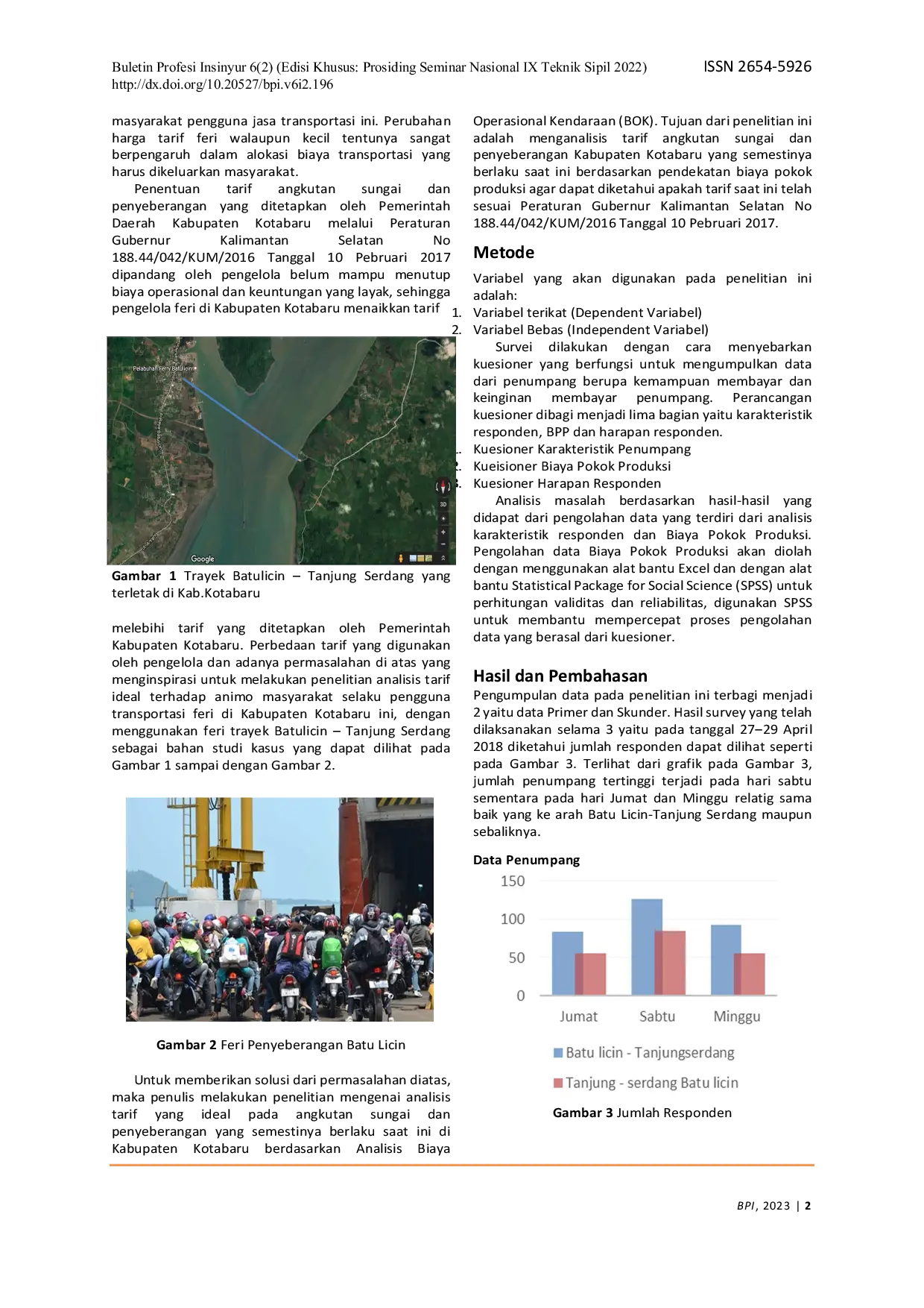 Buletin Profesi InsinyurBuletin Profesi InsinyurPenelitian ini bertujuan untuk menganalisis tarif ideal angkutan sungai dan penyeberangan yang semestinya berlaku saat ini berdasarkan pendekatan biaya pokok produksi agar dapat diketahui apakah tarif saat ini sudah mempertimbangkan kepentingan pengelola dan pengguna. Metode penelitian ini menggunakan analisis masalah berdasarkan hasil pengolahan data yang terdiri dari analisis karakteristik responden dan Biaya Pokok Produksi, untuk mengukur tingkat kemampuan daya beli masyarakat Kabupaten Kotabaru berdasarkan kemauan untuk membayar dan kemampuan daya beli alokasi pendapatan masyarakat terhadap jasa ASDP Kabupaten Kotabaru.