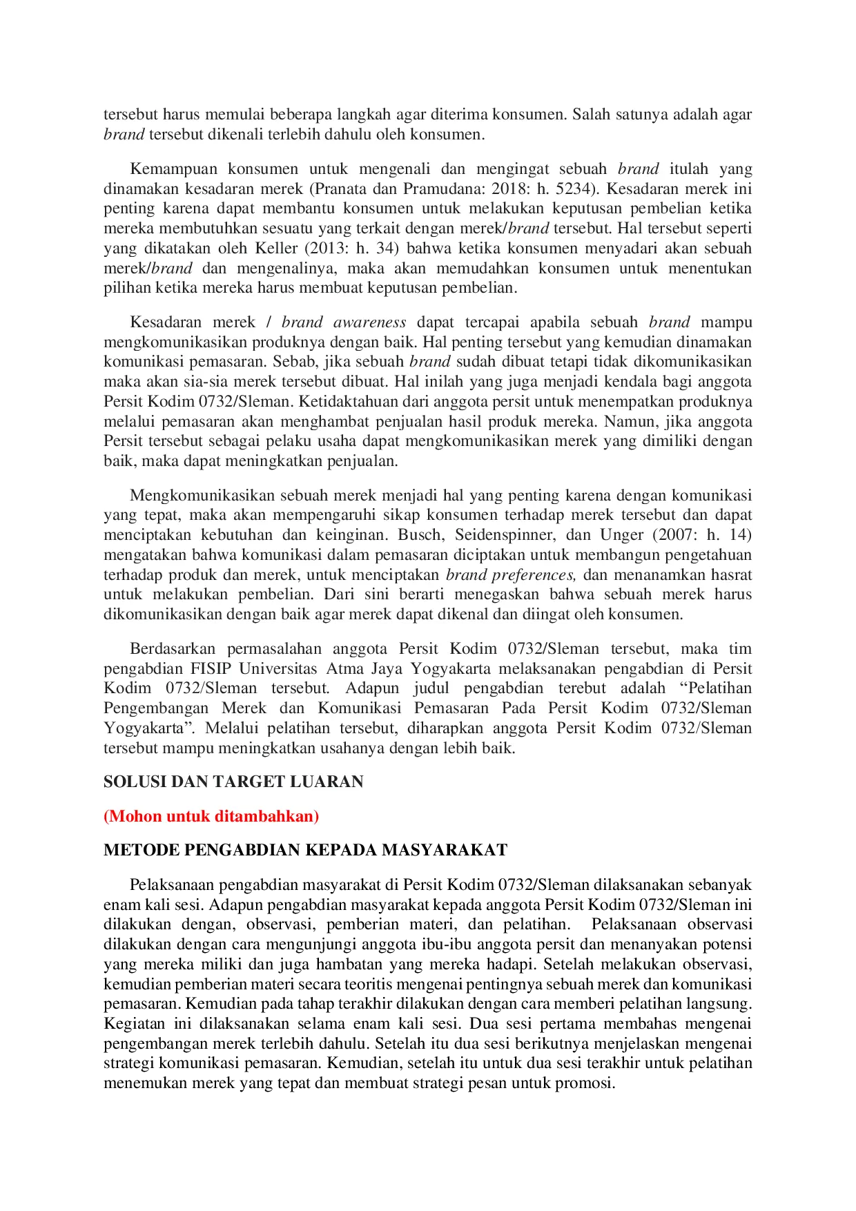 Jurnal Abdimas FISIBJurnal Abdimas FISIBPersit Kodim 0732/Sleman yang beranggotakan istri-istri prajurit TNI-AD memiliki banyak potensi di bidang usaha, salah satunya adalah potensi untuk memproduksi makanan ringan yang dapat menjadi Usaha Mikro Kecil Menengah (UMKM). Namun, potensi tersebut belum didukung dengan kemampuan untuk melakukan komunikasi pemasaran yang memadai, sehingga menghambat pengembangan UMKM tersebut. Tim pengabdian Fakultas Ilmu Sosial dan Ilmu Politik Universitas Atma Jaya Yogyakarta memberikan pelatihan dasar-dasar komunikasi pemasaran dan perancangan merek kepada Persit 0732/Sleman, dengan harapan dapat mendorong peningkatan pemanfaatan media sosial bagi UMKM dari Persit Kodim 0732/Sleman.