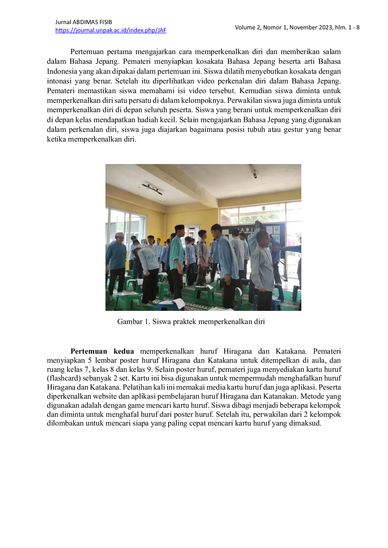 Jurnal Abdimas FISIBJurnal Abdimas FISIBSekolah Menengah Pertama Islam Terpadu Bina Masyarakat Mandiri (SMP IT BMM) merupakan sekolah yang tidak berbayar, ditujukan untuk siswa dari keluarga yang kurang mampu. Salah satu komunitas di Jepang tertarik dengan sekolah ini dan menyediakan beasiswa kunjungan ke Jepang bagi siswa-siswa di sekolah ini. Masalah yang dihadapi adalah para siswa sama sekali tidak memiliki gambaran mengenai negara Jepang dan juga tidak memiliki kemampuan Bahasa Jepang sama sekali. Kegiatan Pengabdian kepada Masyarakat ini diharapkan bisa membantu menjawab masalah yang dihadapi sekolah ini. Kegiatan yang dilakukan meliputi pengajaran huruf Hiragana dan Katakana, pelatihan memberikan salam dengan gesture yang benar, pengenalan budaya dan kehidupan di Jepang. Selain memberikan pengajaran, ada juga pemberian media pembelajaran seperti poster dan kartu huruf (flash card) Hiragana-Katakana. Melalui kegiatan ini diharapkan siswa bisa mendapatkan beasiswa kunjungan ke Jepang dan ketika berkunjung ke sana, siswa sudah memiliki bekal pengetahuan Bahasa dan budaya Jepang.