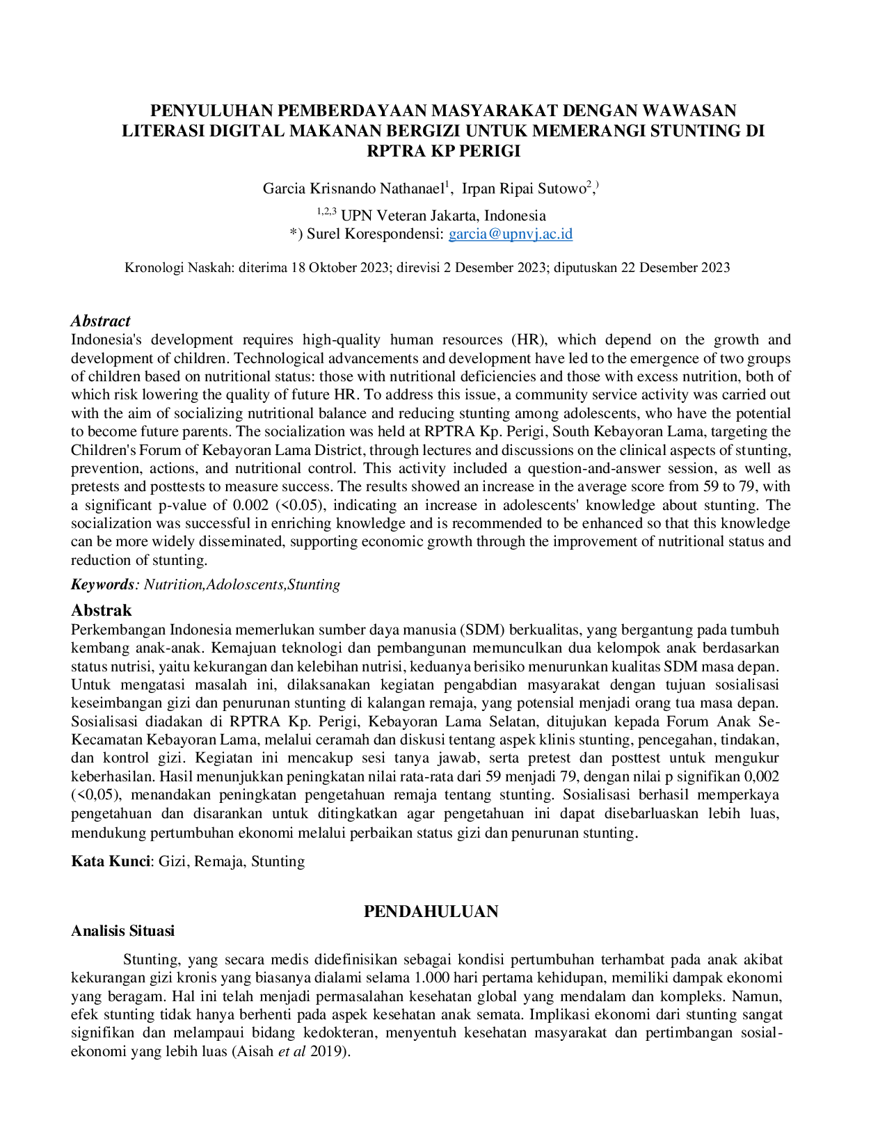 Jurnal Abdimas FISIBJurnal Abdimas FISIBPerkembangan Indonesia memerlukan sumber daya manusia (SDM) berkualitas, yang bergantung pada tumbuh kembang anak-anak. Kemajuan teknologi dan pembangunan memunculkan dua kelompok anak berdasarkan status nutrisi, yaitu kekurangan dan kelebihan nutrisi, keduanya berisiko menurunkan kualitas SDM masa depan. Untuk mengatasi masalah ini, dilaksanakan kegiatan pengabdian masyarakat dengan tujuan sosialisasi keseimbangan gizi dan penurunan stunting di kalangan remaja, yang potensial menjadi orang tua masa depan. Sosialisasi diadakan di RPTRA Kp. Perigi, Kebayoran Lama Selatan, ditujukan kepada Forum Anak Se-Kecamatan Kebayoran Lama, melalui ceramah dan diskusi tentang aspek klinis stunting, pencegahan, tindakan, dan kontrol gizi. Kegiatan ini mencakup sesi tanya jawab, serta pretest dan posttest untuk mengukur keberhasilan. Hasil menunjukkan peningkatan nilai rata-rata dari 59 menjadi 79, dengan nilai p signifikan 0,002 (<0,05), menandakan peningkatan pengetahuan remaja tentang stunting. Sosialisasi berhasil memperkaya pengetahuan dan disarankan untuk ditingkatkan agar pengetahuan ini dapat disebarluaskan lebih luas, mendukung pertumbuhan ekonomi melalui perbaikan status gizi dan penurunan stunting.