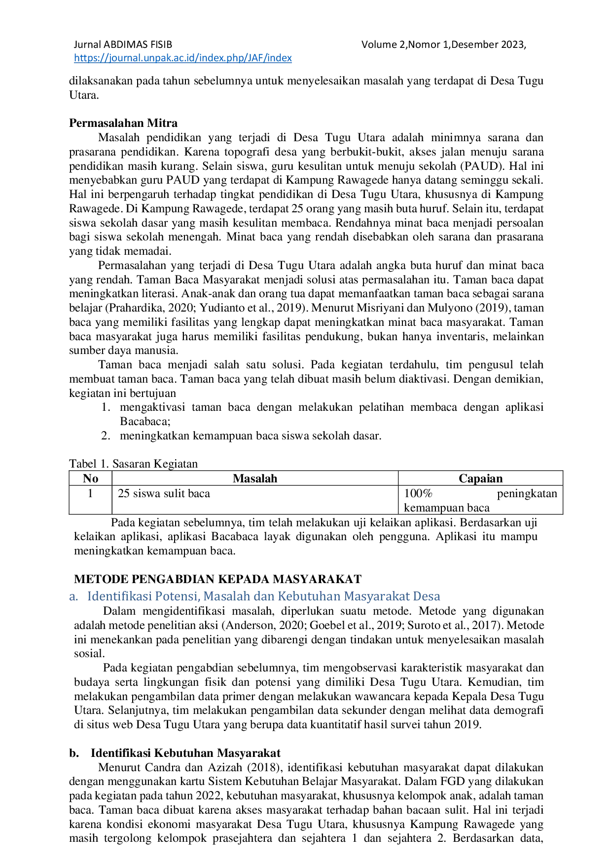 Jurnal Abdimas FISIBJurnal Abdimas FISIBDesa Tugu Utara merupakan salah satu desa yang terletak di Kecamatan Cisarua, Kabupaten Bogor. Berdasarkan data penduduk, mayoritas penduduk di Desa Tugu Utara bekerja pada bidang pertanian, perkebunan, dan buruh. Berdasarkan observasi yang telah dilakukan, desa ini memiliki berbagai potensi. Pertama, desa ini memiliki fasilitas umum yang dapat dimanfaatkan untuk berbagai aktivitas, misalnya ruang pertemuan warga, PAUD, area wisata, dsb. Menurut data, jika dikalkulasi, fasilitas umum yang terdapat di desa tersebut mencapai 910.000 ha. Setelah tim melakukan observasi dan wawancara, terdapat lima masalah yang terjadi. Pertama, terdapat 25 warga yang masih buta huruf. Kegiatan ini bertujuan mengentaskan buta huruf dan sulit baca di Desa Tugu Utara. Metode yang digunakan dalam kegiatan ini adalah metode penelitian tindakan dan solusi atas permasalahan masyarakat. Metode ini adalah metode yang menggabungkan metode penelitian dan rekayasa sosial. Rekayasa sosial akan dilakukan berdasarkan data riset. Hasilnya, terjadi peningkatan kemampuan baca siswa sekolah dasar di Kampung Rawagede, yakni 14 siswa mahir membaca, 4 orang siswa berada di level medioker, dan 5 siswa berada di level semenjana.