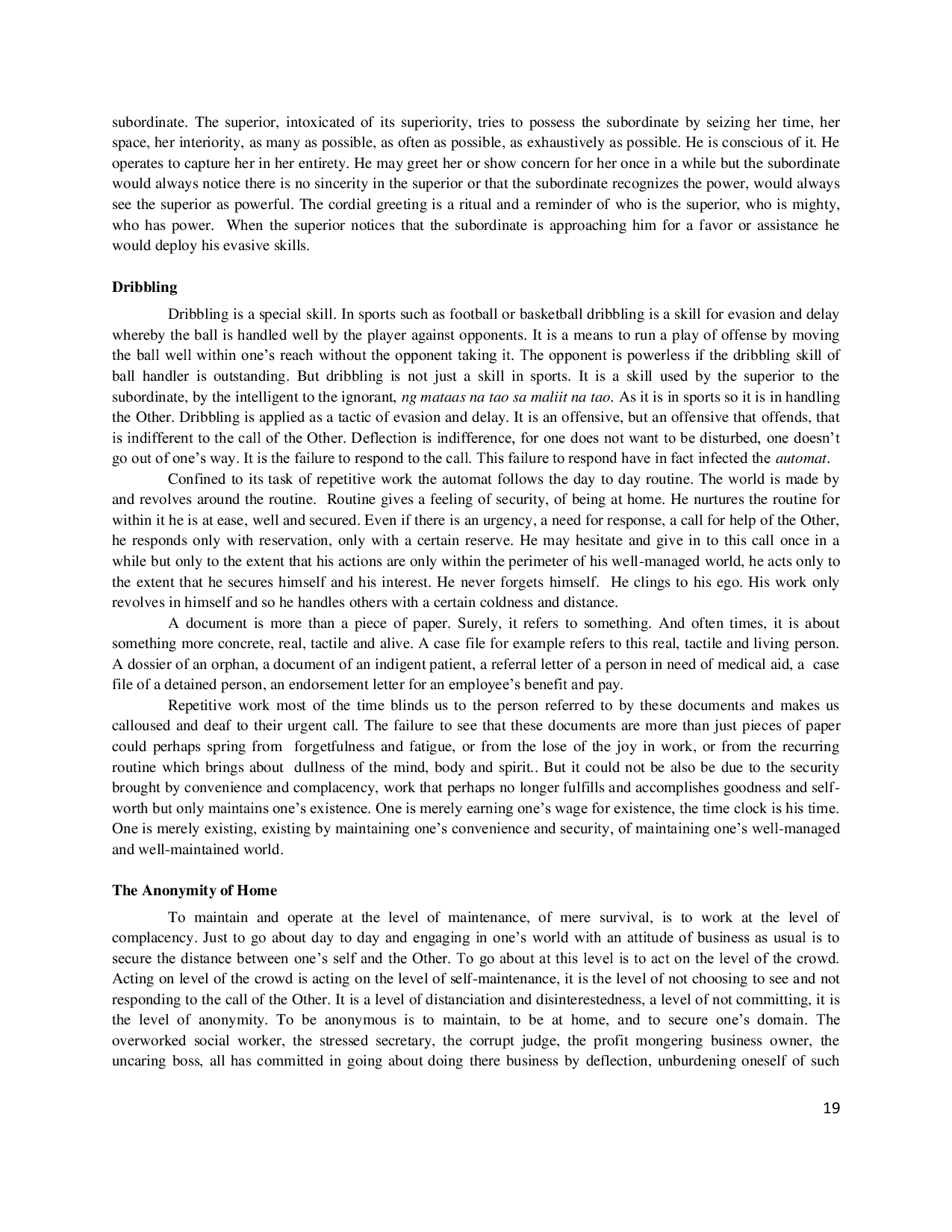 Ketidakpedulian muncul dari sikap egosentris yang mengedepankan kenyamanan dan keamanan diri sendiri, sehingga mengabaikan seruan dari yang lain.Menjadi manusia berarti hidup dalam relasi, yaitu merespons panggilan yang lain dengan tanggung jawab tanpa pamrih.Kebenaran kemanusiaan terwujud dalam pembukaan diri terhadap kemiskinan dan penderitaan orang lain sebagai bentuk pengakuan terhadap keadilan.