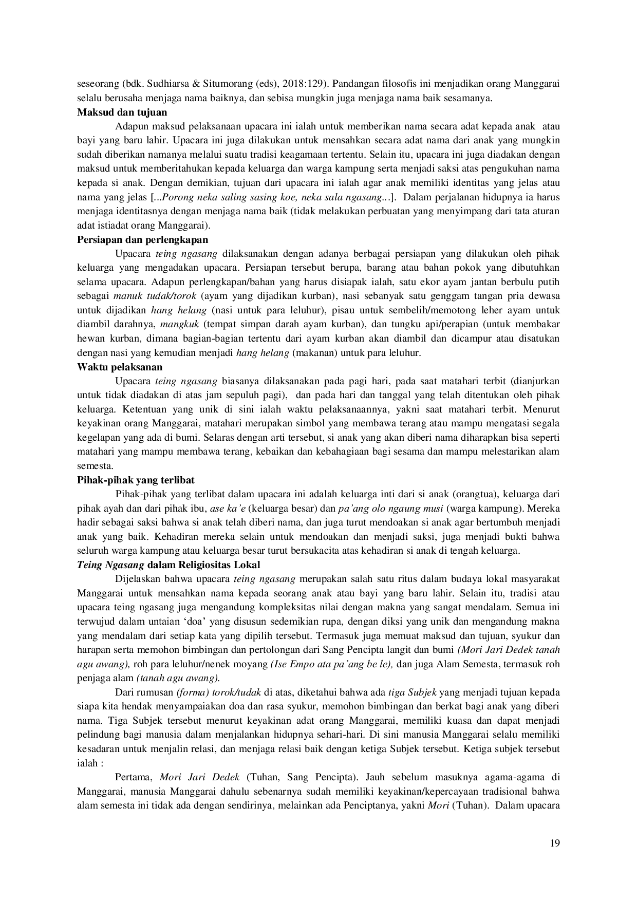Saran penelitian lanjutan: 1. Mengkaji lebih dalam tentang makna dan fungsi nama dalam tradisi Manggarai, serta bagaimana nama tersebut mempengaruhi identitas dan perilaku individu dalam masyarakat Manggarai. 2. Melakukan studi komparatif antara upacara Teing Ngasang dengan upacara inisiasi lainnya dalam budaya Manggarai, untuk memahami lebih lanjut tentang peran dan signifikansi upacara inisiasi dalam masyarakat tersebut. 3. Meneliti lebih lanjut tentang hubungan antara agama Katolik dan tradisi lokal Manggarai, khususnya dalam hal adaptasi dan integrasi ajaran Katolik dengan nilai-nilai budaya Manggarai, serta bagaimana hal ini mempengaruhi praktik keagamaan masyarakat Manggarai.