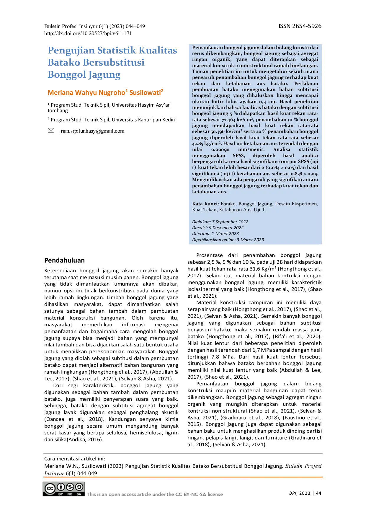 Buletin Profesi InsinyurBuletin Profesi InsinyurPemanfaatan bonggol jagung dalam bidang konstruksi terus dikembangkan, bonggol jagung sebagai agregat ringan organik, yang dapat diterapkan sebagai material konstruksi non struktural ramah lingkungan. Tujuan penelitian ini untuk mengetahui sejauh mana pengaruh penambahan bonggol jagung terhadap kuat tekan dan ketahanan aus batako. Perlakuan pembuatan batako menggunakan bahan subtitusi bonggol jagung yang dihaluskan hingga mencapai ukuran butir lolos ayakan 0,3 cm. Hasil penelitian menunjukkan bahwa kualitas batako dengan subtitusi bonggol jagung 5 % didapatkan hasil kuat tekan rata-rata sebesar 77.463 kg/cm², penambahan 10 % bonggol jagung mendapatkan hasil kuat tekan rata-rata sebesar 50.396 kg/cm² serta 20 % penambahan bonggol jagung diperoleh hasil kuat tekan rata-rata sebesar 42.85 kg/cm². Hasil uji ketahanan aus terendah dengan statistik nilai diperoleh dengan analisa SPSS, hasil signifikansi output uji t kuat tekan lebih besar dari α (0,084 > 0,05) dan hasil signifikansi ( uji t) ketahanan aus sebesar 0,838 > 0,05. Mengindikasikan ada pengaruh yang signifikan antara penambahan bonggol jagung terhadap kuat tekan dan ketahanan aus.