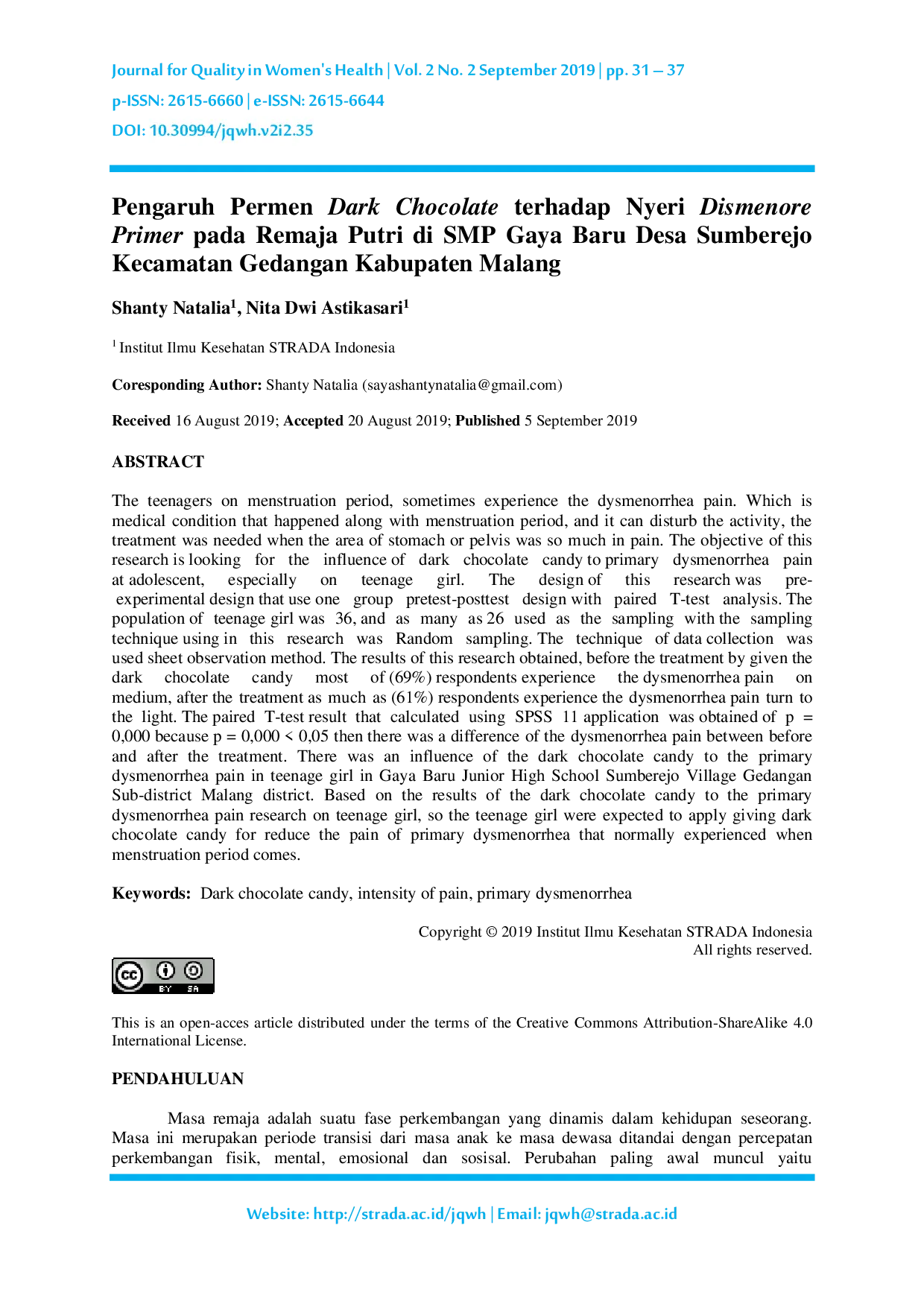Journal for Quality in Women's HealthJournal for Quality in Women's HealthRemaja putri pada masa menstruasi sering mengalami dismenore, yaitu kondisi medis yang ditandai dengan nyeri pada daerah perut atau panggul yang dapat mengganggu aktivitas sehari-hari. Penelitian ini bertujuan untuk mengetahui pengaruh pemberian permen dark chocolate terhadap nyeri dismenore primer pada remaja putri. Desain penelitian yang digunakan adalah pre-eksperimental dengan rancangan one group pretest-posttest dan analisis data menggunakan uji paired T-test. Populasi penelitian terdiri dari 36 remaja putri, dengan sampel sebanyak 26 orang yang dipilih secara acak. Teknik pengumpulan data dilakukan melalui observasi. Hasil penelitian menunjukkan bahwa sebelum perlakuan, sebanyak 69% responden mengalami nyeri sedang, namun setelah diberi permen dark chocolate, 61% responden hanya mengalami nyeri ringan. Hasil uji statistik menunjukkan nilai p = 0,000 (p < 0,05), yang berarti terdapat perbedaan bermakna antara tingkat nyeri sebelum dan sesudah perlakuan. Dapat disimpulkan bahwa terdapat pengaruh pemberian permen dark chocolate terhadap penurunan nyeri dismenore primer pada remaja putri di SMP Gaya Baru Sumberejo. Disarankan agar remaja putri memanfaatkan permen dark chocolate sebagai upaya mengurangi nyeri saat menstruasi.