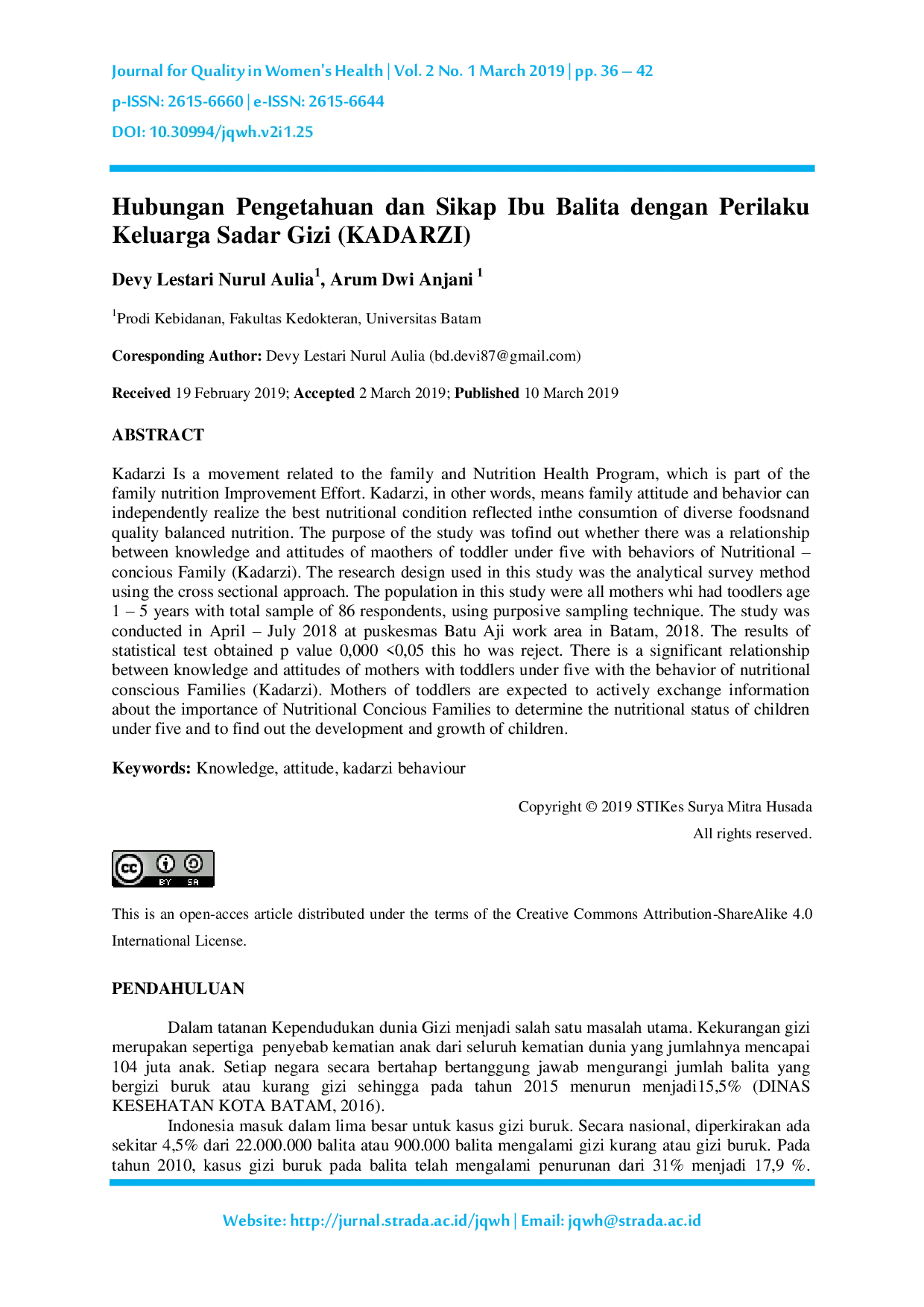 Journal for Quality in Women's HealthJournal for Quality in Women's HealthKadarzi adalah gerakan yang berkaitan dengan Program Kesehatan dan Gizi Keluarga, yang merupakan bagian dari Upaya Peningkatan Gizi Keluarga. Kadarzi, dalam arti lain, berarti sikap dan perilaku keluarga dapat secara mandiri mewujudkan kondisi gizi terbaik yang tercermin dalam konsumsi makanan yang beragam dan gizi seimbang. Tujuan penelitian ini adalah untuk mengetahui apakah ada hubungan antara pengetahuan dan sikap ibu balita dengan perilaku Keluarga Sadar Gizi (Kadarzi). Desain penelitian yang digunakan dalam penelitian ini adalah metode survei analitik dengan pendekatan cross sectional. Populasi dalam penelitian ini adalah semua ibu yang memiliki balita berusia 1-5 tahun dengan total sampel 86 responden, menggunakan teknik sampling purposive. Penelitian ini dilakukan pada bulan April - Juli 2018 di wilayah kerja Puskesmas Batu Aji di Batam, 2018. Hasil uji statistik diperoleh nilai p 0,000 <0,05, sehingga Ho ditolak. Ada hubungan yang signifikan antara pengetahuan dan sikap ibu dengan perilaku Keluarga Sadar Gizi (Kadarzi). Ibu balita diharapkan untuk aktif bertukar informasi tentang pentingnya Keluarga Sadar Gizi untuk menentukan status gizi anak di bawah lima tahun dan untuk mengetahui perkembangan dan pertumbuhan anak.