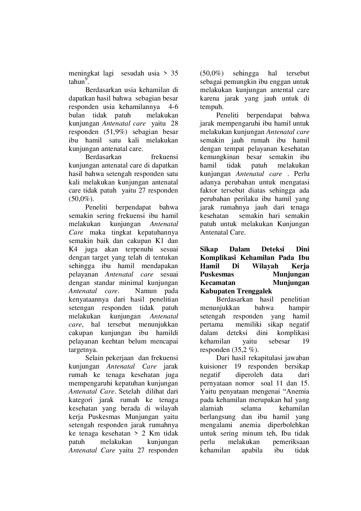 Berdasarkan penelitian ini dapat disimpulkan bahwa sebagian besar responden tidak patuh melakukan kunjungan Antenatal Care (61,1%) dan sebagian besar responden memiliki sikap negatif dalam deteksi dini komplikasi kehamilan (56,6%).Terdapat pengaruh yang sangat kuat antara kepatuhan kunjungan Antenatal Care terhadap sikap dalam deteksi dini komplikasi kehamilan pada ibu hamil di wilayah kerja Puskesmas Munjungan Kecamatan Munjungan Kabupaten Trenggalek.