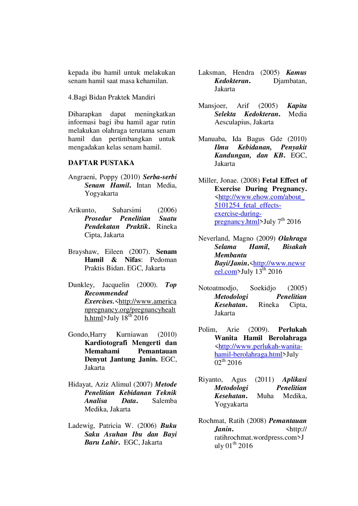 Pertama, perlu diteliti efek kombinasi senam hamil dan jalan kaki secara rutin terhadap perkembangan janin dan kesejahteraan ibu hamil, apakah intervensi gabungan ini memberikan manfaat lebih besar dibandingkan masing-masing aktivitas secara terpisah. Kedua, penting untuk mengevaluasi pengaruh durasi dan frekuensi senam hamil terhadap keteraturan denyut jantung janin, termasuk berapa lama dan seberapa sering ibu hamil sebaiknya berolahraga untuk mencapai hasil optimal tanpa menimbulkan kelelahan. Ketiga, perlu dikaji bagaimana faktor pendukung seperti pengetahuan ibu, akses terhadap kelas senam hamil, dan pendampingan bidan memengaruhi keberhasilan pelaksanaan senam hamil di tingkat masyarakat, agar dapat dirancang intervensi berbasis komunitas yang lebih efektif. Studi-studi ini akan melengkapi temuan penelitian sebelumnya dengan pendekatan yang lebih menyeluruh terhadap aktivitas fisik selama kehamilan. Melalui pendekatan kombinasi, dosis tepat, dan konteks sosial, penelitian lanjutan dapat memberikan pedoman praktis yang lebih komprehensif bagi ibu hamil. Hasilnya diharapkan dapat meningkatkan partisipasi ibu dalam aktivitas fisik aman selama kehamilan. Selain itu, dapat membantu tenaga kesehatan merancang program senam yang lebih efektif dan mudah diakses. Penelitian juga perlu mempertimbangkan variasi latar belakang sosial dan budaya ibu hamil. Dengan demikian, rekomendasi yang dihasilkan lebih relevan dan adaptif terhadap kondisi nyata di lapangan. Pendekatan terpadu ini akan mendukung upaya peningkatan kesehatan ibu dan janin secara berkelanjutan.