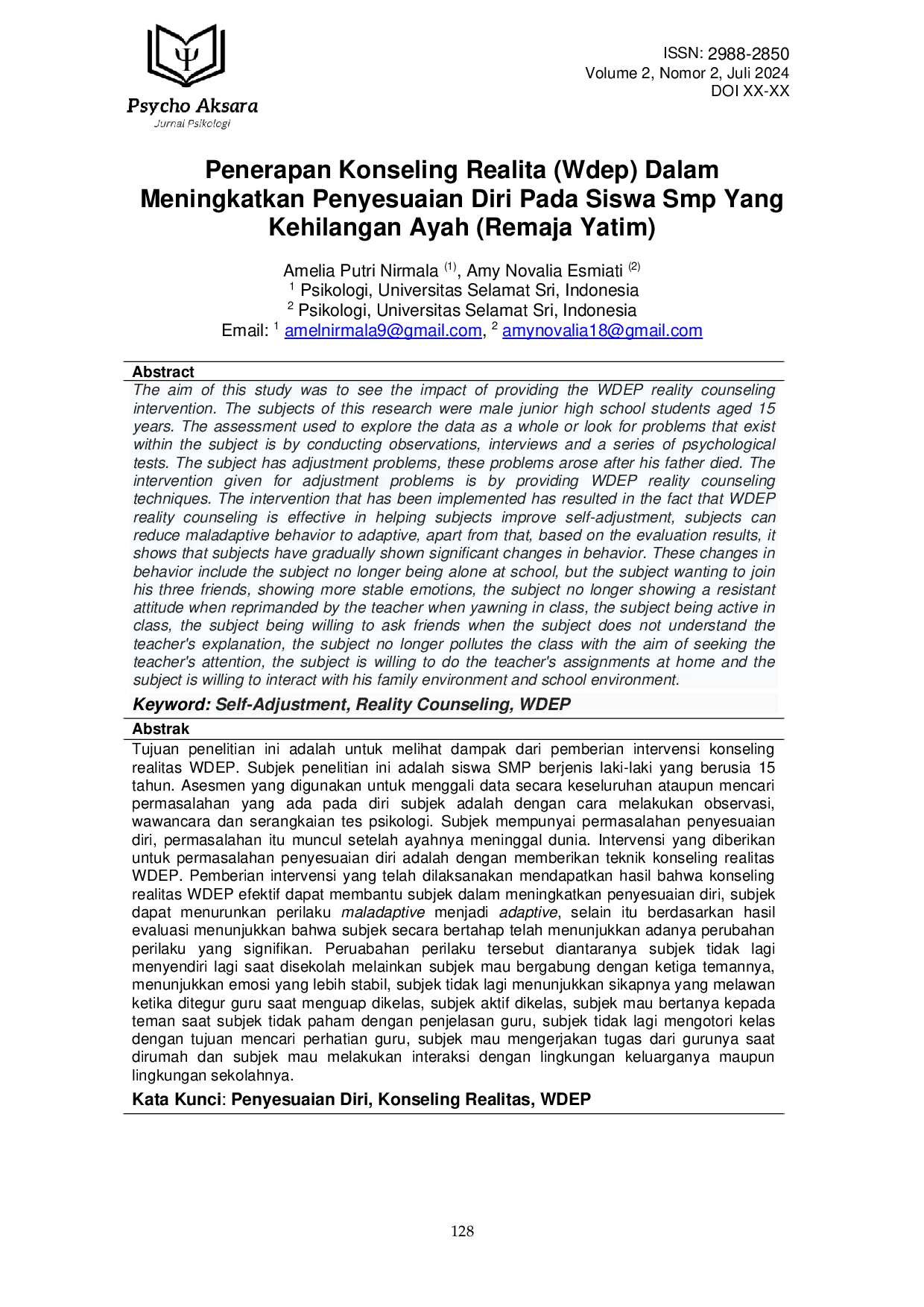 New Psycho Aksara : Jurnal PsikologiNew Psycho Aksara : Jurnal PsikologiTujuan penelitian ini adalah untuk melihat dampak dari pemberian intervensi konseling realitas WDEP. Subjek penelitian ini adalah siswa SMP berjenis laki-laki yang berusia 15 tahun. Asesmen yang digunakan untuk menggali data secara keseluruhan ataupun mencari permasalahan yang ada pada diri subjek adalah dengan cara melakukan observasi, wawancara dan serangkaian tes psikologi. Subjek mempunyai permasalahan penyesuaian diri, permasalahan itu muncul setelah ayahnya meninggal dunia. Intervensi yang diberikan untuk permasalahan penyesuaian diri adalah dengan memberikan teknik konseling realitas WDEP. Pemberian intervensi yang telah dilaksanakan mendapatkan hasil bahwa konseling realitas WDEP efektif dapat membantu subjek dalam meningkatkan penyesuaian diri, subjek dapat menurunkan perilaku maladaptive menjadi adaptive, selain itu berdasarkan hasil evaluasi menunjukkan bahwa subjek secara bertahap telah menunjukkan adanya perubahan perilaku yang signifikan. Perubahan perilaku tersebut diantaranya subjek tidak lagi menyendiri lagi saat disekolah melainkan subjek mau bergabung dengan ketiga temannya, menunjukkan emosi yang lebih stabil, subjek tidak lagi menunjukkan sikapnya yang melawan ketika ditegur guru saat menguap dikelas, subjek aktif dikelas, subjek mau bertanya kepada teman saat subjek tidak paham dengan penjelasan guru, subjek tidak lagi mengotori kelas dengan tujuan mencari perhatian guru, subjek mau mengerjakan tugas dari gurunya saat dirumah dan subjek mau melakukan interaksi dengan lingkungan keluarganya maupun lingkungan sekolahnya.