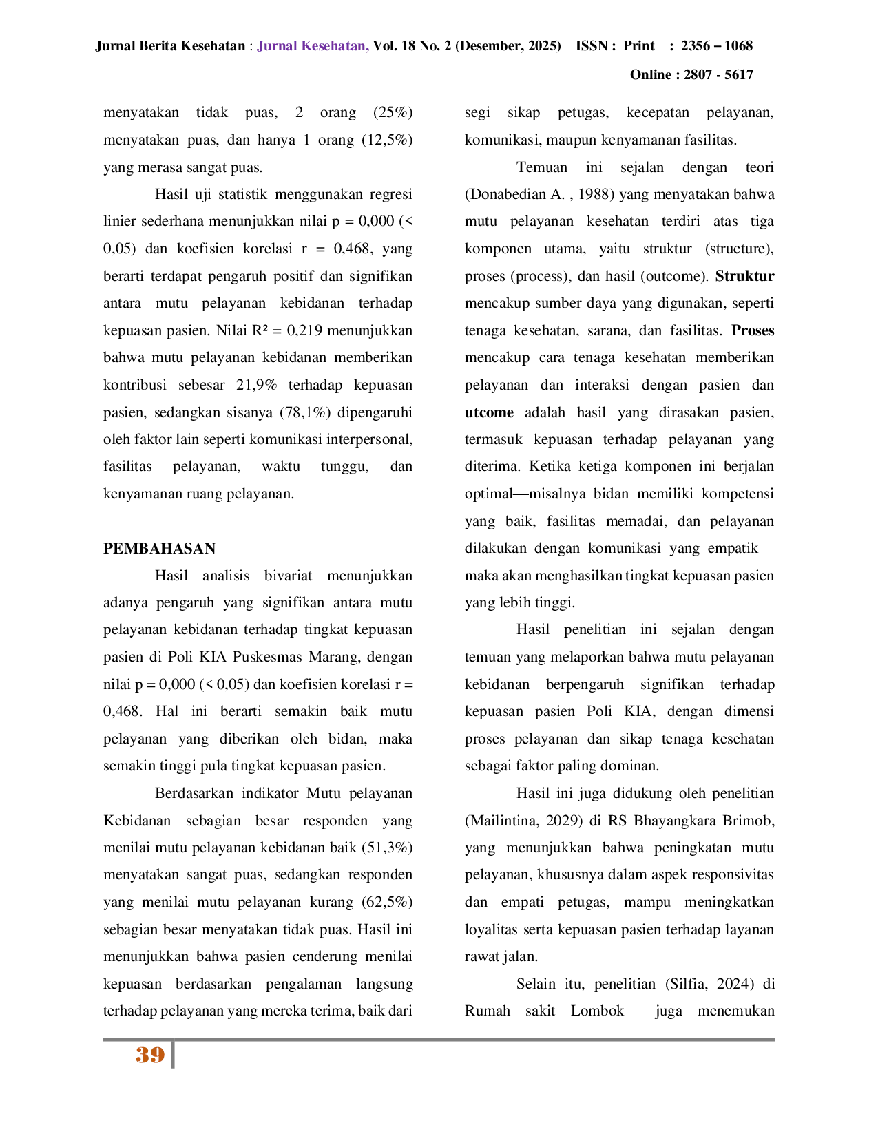 Jurnal Berita KesehatanJurnal Berita KesehatanPelayanan kebidanan yang bermutu merupakan salah satu faktor penting dalam meningkatkan kepuasan pasien, terutama pada pelayanan Kesehatan Ibu dan Anak (KIA) di fasilitas kesehatan. Kepuasan pasien menjadi indikator keberhasilan pelayanan, karena mencerminkan sejauh mana harapan pasien terpenuhi melalui kualitas pelayanan yang diberikan bidan. Penelitian ini bertujuan untuk mengetahui pengaruh mutu pelayanan kebidanan terhadap tingkat kepuasan pasien di Poli KIA. Penelitian ini menggunakan desain kuantitatif dengan pendekatan cross-sectional. Hasil analisis menunjukkan bahwa sebagian besar responden menilai mutu pelayanan kebidanan dalam kategori baik, cukup, dan kurang. Tingkat kepuasan pasien menunjukkan bahwa mayoritas pasien merasa puas dan sangat puas. Hasil uji regresi linier sederhana menunjukkan adanya pengaruh yang signifikan antara mutu pelayanan kebidanan terhadap kepuasan pasien dengan nilai p = 0,000 dan koefisien korelasi r = 0,468, yang berarti mutu pelayanan berkontribusi secara positif terhadap kepuasan pasien Poli KIA. Dapat disimpulkan bahwa semakin baik mutu pelayanan kebidanan, semakin tinggi pula tingkat kepuasan pasien.