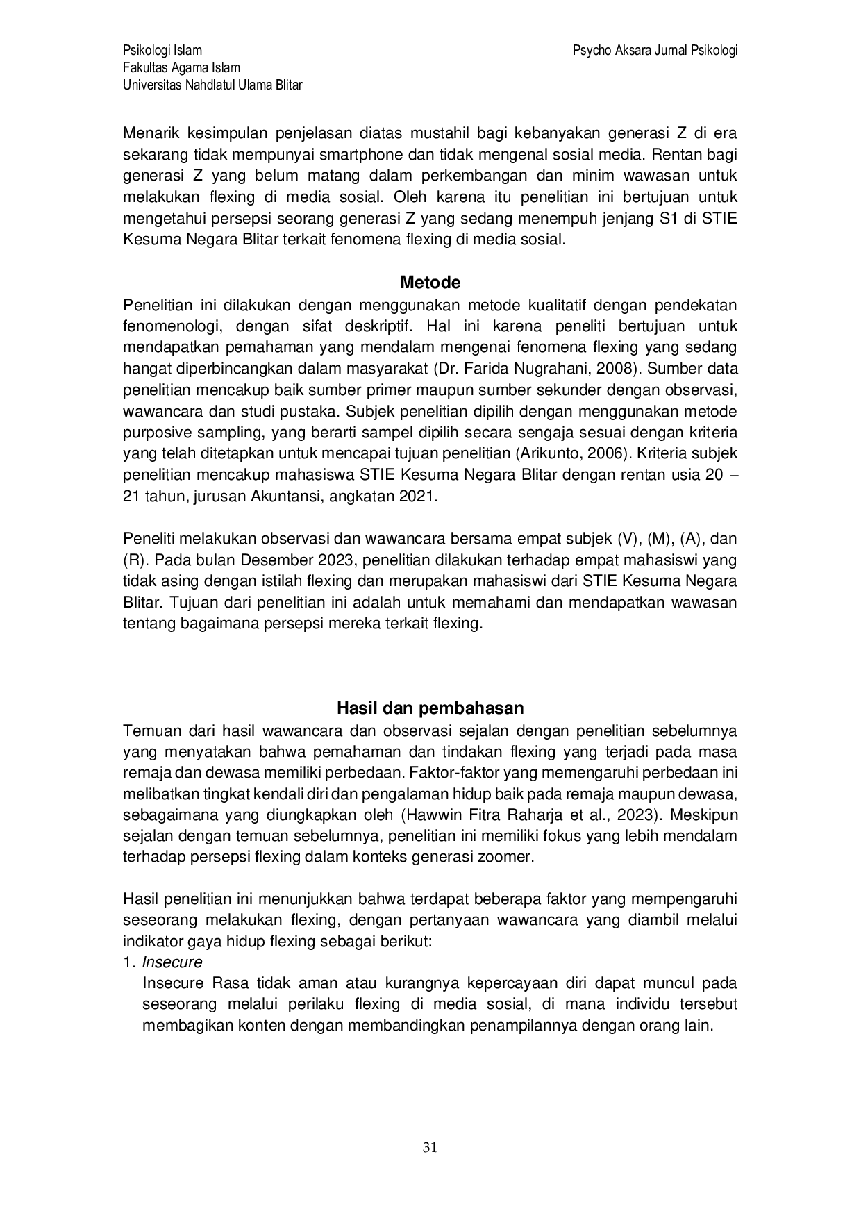 New Psycho Aksara : Jurnal PsikologiNew Psycho Aksara : Jurnal PsikologiTujuan penelitian ini dilakukan untuk mendalami pemahaman tentang bagaimana generasi zoomer melihat dan menghadapi fenomena flexing. Metode pengumpulan data melibatkan catatan lapangan, wawancara, dan observasi. Penelitian ini menggunakan pendekatan fenomenologis dalam pendekatannya dan bersifat kualitatif. Subjek penelitian menggunakan empat mahasiswi STIE Kesuma Negara Blitar angkatan 2021. Hasil penelitian menunjukkan bahwa insecure tidak selalu mengakibatkan flexing, kemudian individu yang cenderung mengekspresikan diri secara berlebihan seringkali terlibat dalam manipulasi diri. Seseorang yang merasa puas dengan menjelajahi tempat-tempat yang belum menjadi tren cenderung menunjukkan perilaku berlebihan. Alasan di balik perilaku menunjukkan diri bervariasi, dan rangsangan yang diterima seseorang dapat menjadi pemicu dari tindakan ini. Kecenderungan untuk menunjukkan diri tidak selalu bersifat memaksa situasi, dan kemampuan seseorang untuk mengendalikan diri dapat mencegah perilaku menunjukkan diri karena kesulitan dalam berinteraksi sosial.