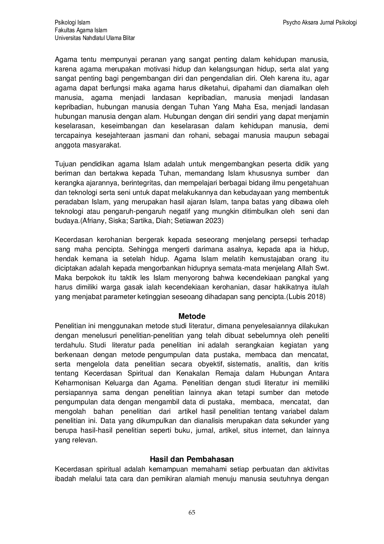 Berdasarkan hasil penelitian ini, saran penelitian lanjutan yang dapat dilakukan adalah: 1. Menganalisis lebih lanjut faktor-faktor yang mempengaruhi kecerdasan spiritual pada remaja, seperti lingkungan keluarga, pendidikan agama, dan pengalaman pribadi. 2. Meneliti dampak pendidikan agama yang komprehensif terhadap perilaku remaja, termasuk aspek-aspek seperti moralitas, tanggung jawab sosial, dan pengendalian diri. 3. Mengkaji hubungan antara keharmonisan keluarga dan kecerdasan spiritual remaja, serta bagaimana keluarga dapat mendukung pengembangan kecerdasan spiritual anak-anak mereka. Dengan memahami faktor-faktor ini, kita dapat mengembangkan strategi yang lebih efektif untuk meningkatkan kecerdasan spiritual remaja dan mencegah kenakalan. Penelitian lanjutan ini dapat memberikan wawasan yang lebih dalam tentang peran keluarga, agama, dan pendidikan dalam membentuk karakter dan perilaku remaja.