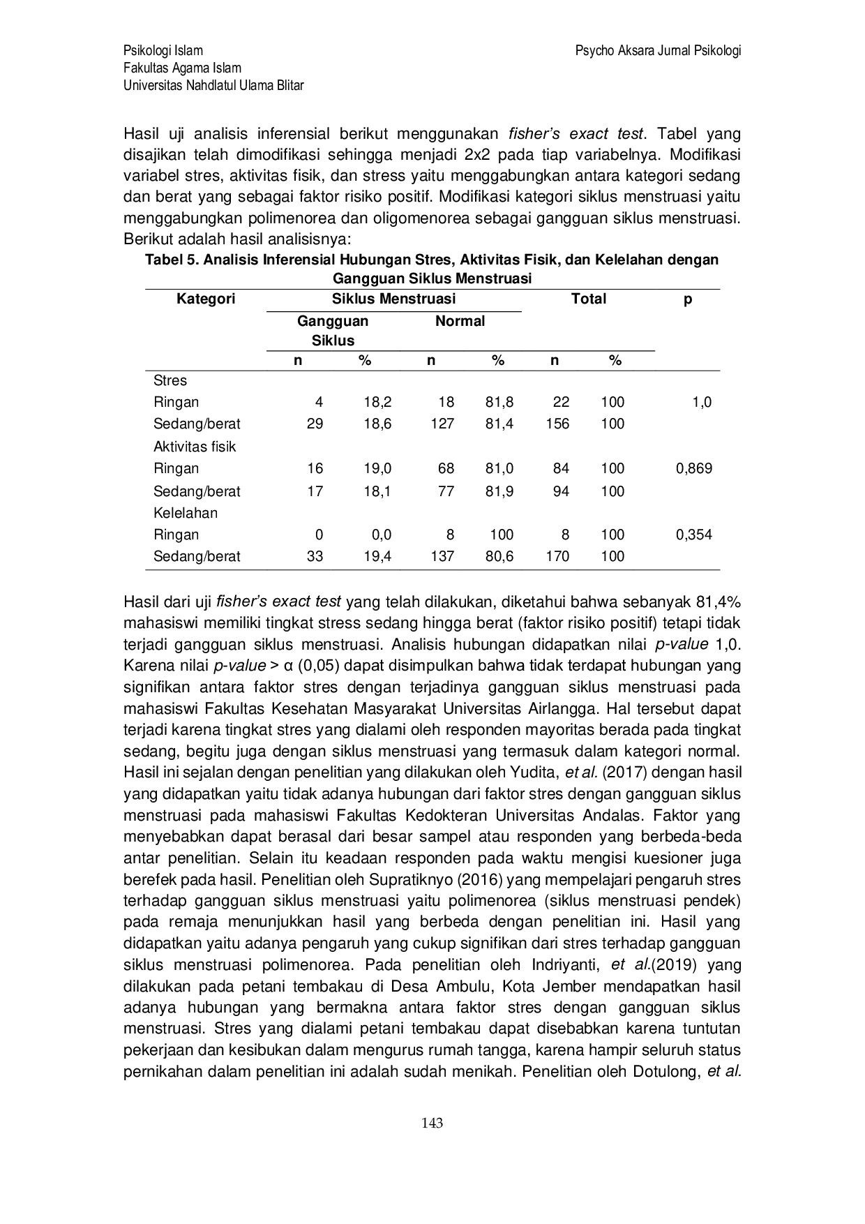 New Psycho Aksara : Jurnal PsikologiNew Psycho Aksara : Jurnal PsikologiSiklus menstruasi adalah jarak antar menstruasi. Siklus menstruasi normal terjadi 22-35 hari. Jarak siklus yang lebih atau kurang termasuk gangguan siklus menstruasi. Gangguan siklus menstruasi sering terjadi pada usia remaja karena kinerja hormon yang belum stabil dan dapat disebabkan karena beberapa faktor gangguan siklus menstruasi diantaranya adalah aktivitas stres, aktivitas fisik, dan kelelahan. Penelitian ini bertujuan untuk menganalisis hubungan antara aktivitas fisik, kelelahan, dan stres dengan gangguan siklus menstruasi pada mahasiswi Fakultas Kesehatan Masyarakat Universitas Airlangga.
