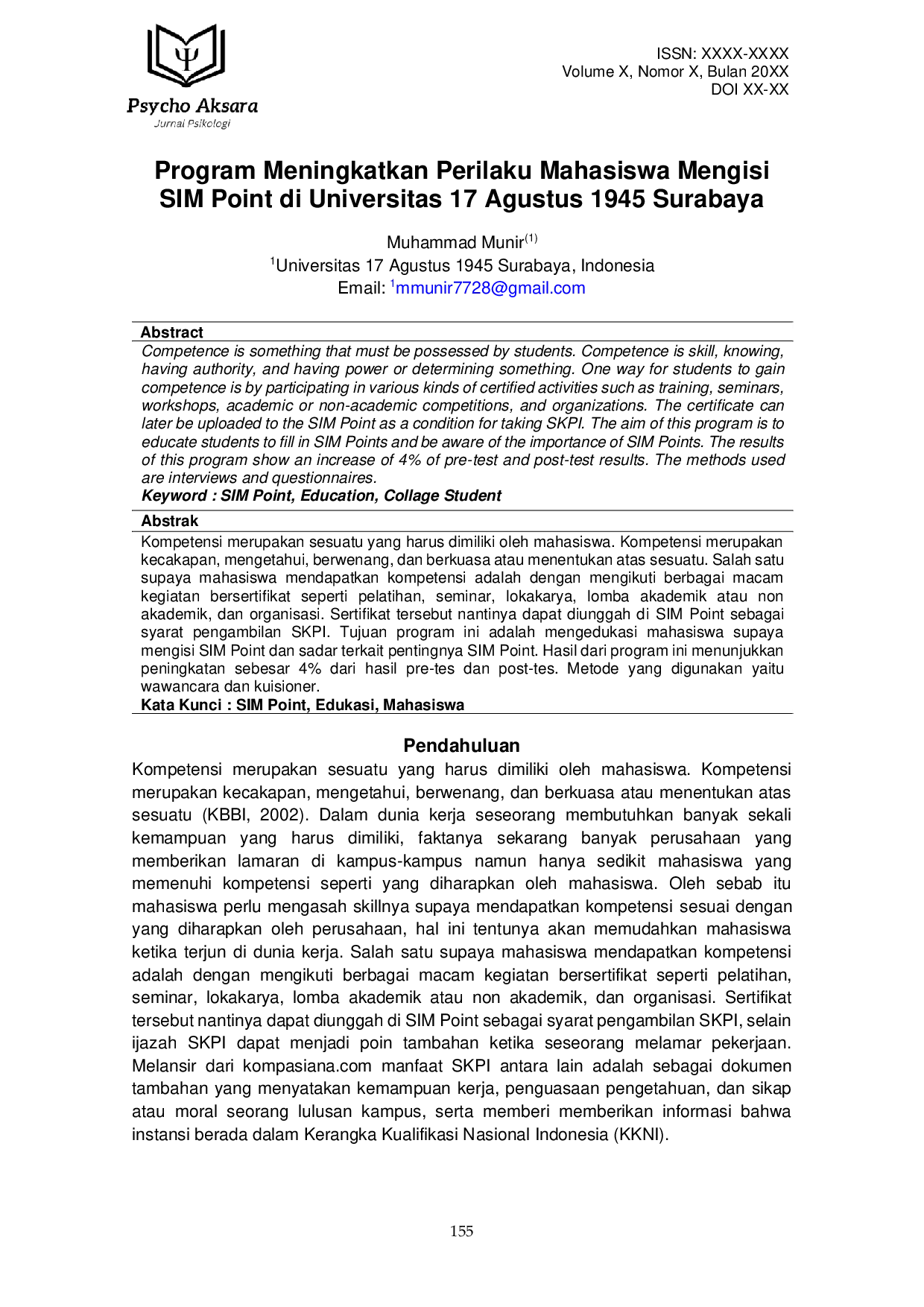 New Psycho Aksara : Jurnal PsikologiNew Psycho Aksara : Jurnal PsikologiKompetensi merupakan sesuatu yang harus dimiliki oleh mahasiswa. Salah satu cara untuk mendapatkan kompetensi adalah dengan mengikuti berbagai kegiatan bersertifikat seperti pelatihan, seminar, lokakarya, lomba akademik atau non-akademik, dan organisasi. Sertifikat tersebut dapat diunggah ke SIM Point sebagai syarat pengambilan SKPI. Program ini bertujuan mengedukasi mahasiswa untuk mengisi SIM Point dan menyadari pentingnya SIM Point. Hasil program menunjukkan peningkatan sebesar 4% dari hasil pre-tes dan post-tes. Metode yang digunakan adalah wawancara dan kuisioner.