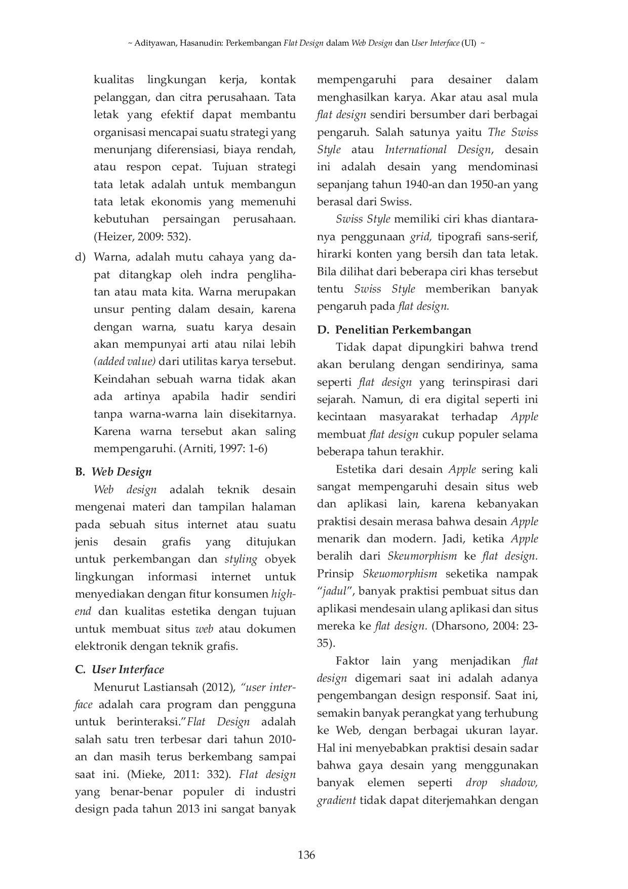 PANTUN: Jurnal Ilmiah Seni BudayaPANTUN: Jurnal Ilmiah Seni BudayaTulisan ini mengungkap tren flat design dalam desain komunikasi visual. Desain komunikasi visual merupakan cara manusia berkomunikasi melalui citra visual. Dalam beberapa tahun terakhir, flat design muncul dalam karya-karya desain komunikasi visual. Banyak perusahaan besar dan terkenal menggunakan flat design seperti Microsoft, Apple, Google, Kompas, dan lainnya. Flat design sangat berbeda dari aliran yang sebelumnya ada karena menciptakan kesederhanaan dengan menghilangkan semua bentuk gradien, bayangan, efek glossy, dan efek lainnya. Dikatakan bahwa flat design merupakan penerapan gaya minimalis dan dikaitkan dengan gaya Swiss yang terkenal pada tahun 1940-an hingga 1950-an. Dalam flat design, elemen dekoratif lain dianggap sebagai kekacauan yang tidak perlu. Jika suatu aspek tidak memiliki fungsi praktis, maka hal tersebut menjadi gangguan bagi pengalaman pengguna. Inilah alasan sifat minimalis dari flat design. Namun, meskipun gaya ini tidak memiliki desain yang mencolok, bukan berarti menjadi membosankan. Warna-warna cerah dan kontras mengilustrasikan dan membuat tombol menonjol dari latar belakang, mudah menarik perhatian serta menangkap perhatian pengguna. Tujuan dari citra minimalis juga berkontribusi pada karakter fungsional dari flat design. Makalah ini menjelaskan lebih lanjut mengenai perkembangan dan penerapan flat design dalam desain komunikasi visual.