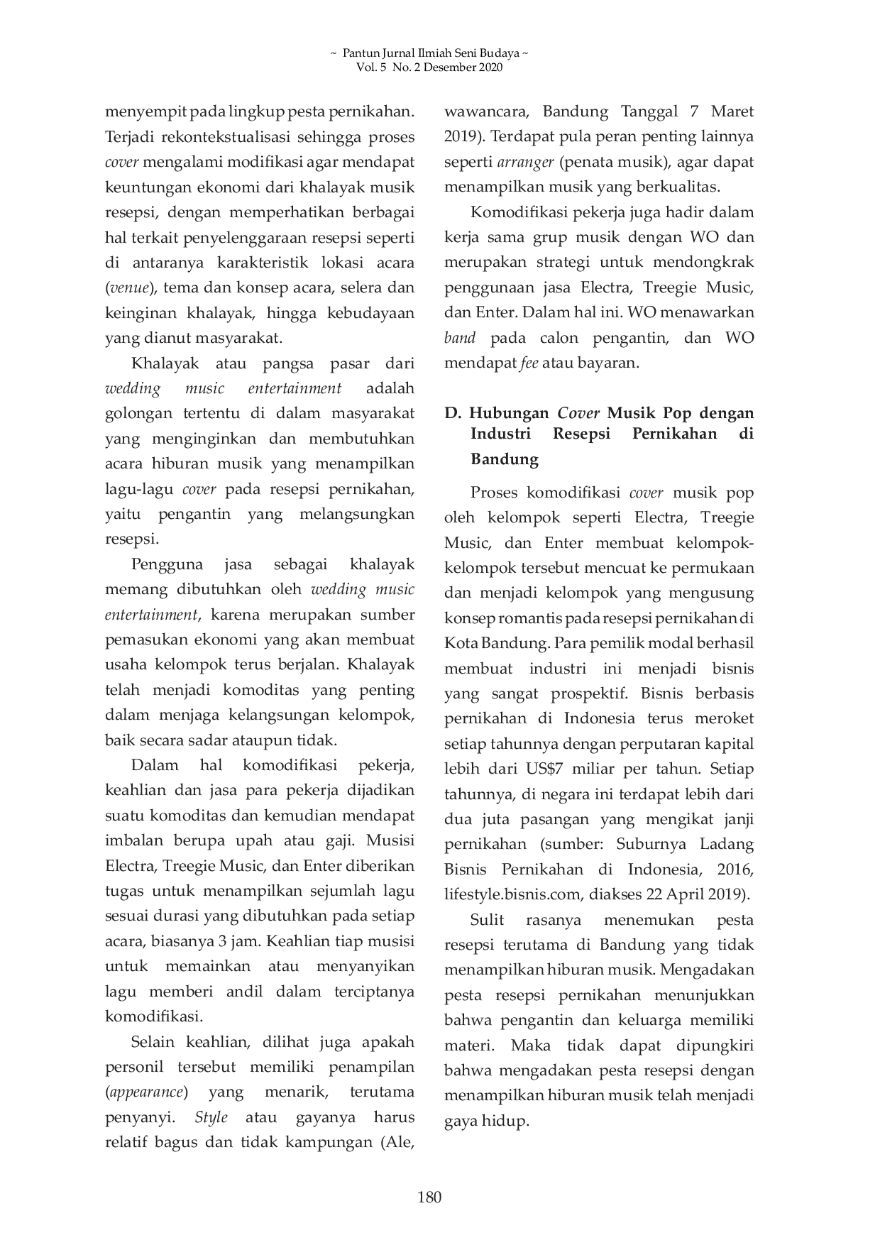 Penelitian ini menyimpulkan bahwa komodifikasi lagu pop cover pada resepsi pernikahan terjadi dalam tiga bentuk.komodifikasi isi, di mana lagu-lagu dikemas menjadi pertunjukan musik yang meriah dan romantis.komodifikasi khalayak, di mana pengantin sebagai klien menjadi sumber keuntungan ekonomi.dan komodifikasi tenaga kerja, di mana keahlian dan jasa musisi dijadikan komoditas.Industri musik resepsi pernikahan menjadi bagian dari industri kreatif yang berkontribusi pada perekonomian, mencerminkan masyarakat yang mengutamakan gengsi dan citra.