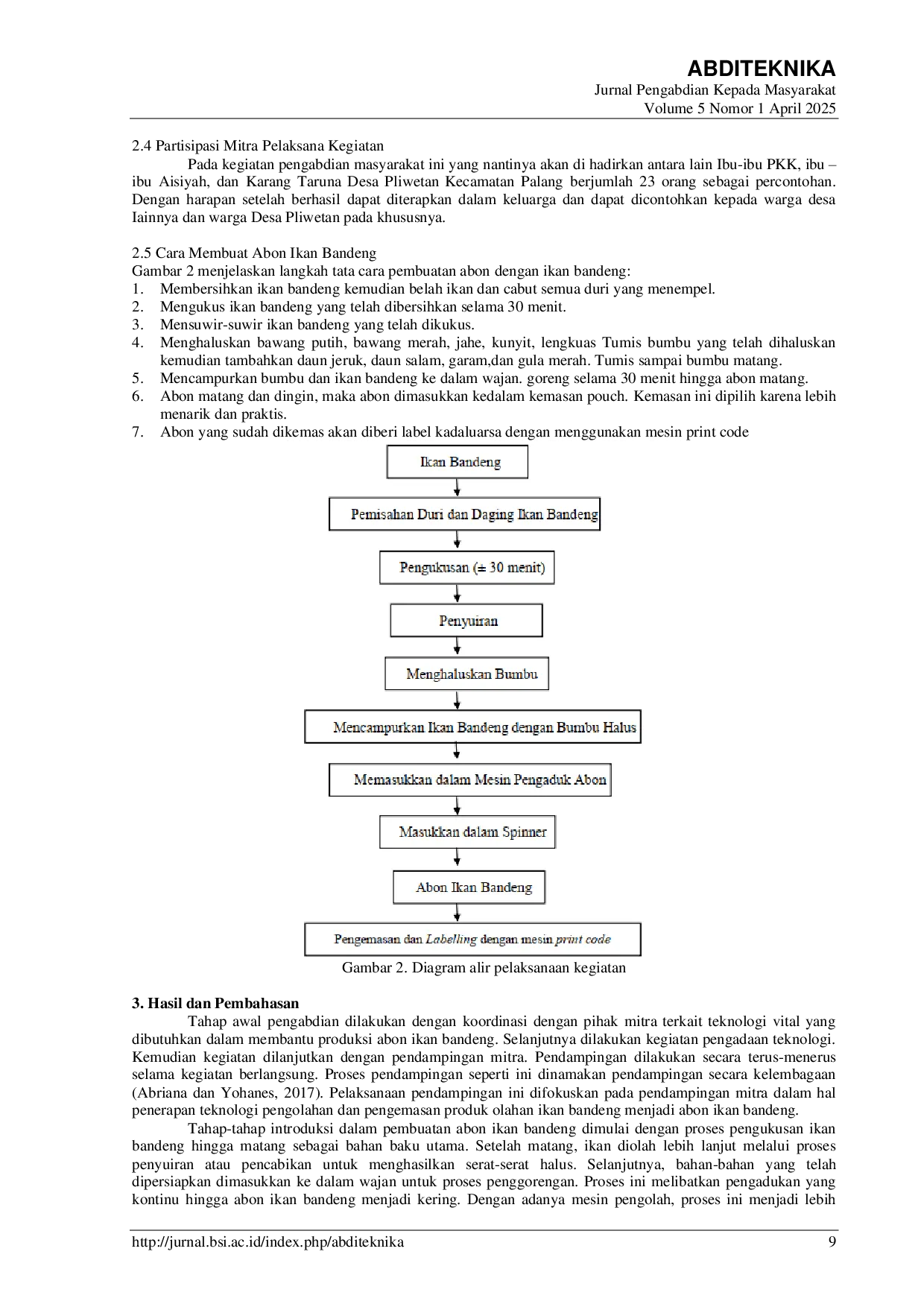 Abditeknika Jurnal Pengabdian MasyarakatAbditeknika Jurnal Pengabdian MasyarakatIkan bandeng memiliki nilai ekonomis tinggi dan sering dimanfaatkan sebagai bahan baku produk olahan. Pemerintah Desa Pliwetan, melalui ibu-ibu PKK, mengembangkan diversifikasi produk berupa abon ikan bandeng. Namun, pandemi menghadirkan tantangan baru, seperti meningkatnya permintaan yang dihadapkan pada proses produksi dan pelabelan yang masih sederhana, sehingga memerlukan waktu lebih lama. Tim PKM Unirow Tuban memberikan solusi melalui metode pengolahan modern, yang meliputi koordinasi, pengadaan alat, dan pendampingan introduksi alat. Tahapan pengabdian dimulai dengan koordinasi bersama mitra untuk menentukan alat dan bahan vital dalam produksi. Selanjutnya, dilakukan pengadaan alat berupa mesin pengaduk abon dan mesin print code. Pengenalan teknologi ini bertujuan meningkatkan efisiensi proses produksi dan kualitas produk. Hasilnya, penggunaan mesin pengaduk abon mampu memangkas waktu produksi hingga setengahnya. Sementara itu, mesin print code menggantikan metode pelabelan manual dengan hasil yang lebih rapi dan mudah dibaca, menghilangkan kesan tempelan kertas pada kemasan. Kesimpulannya, pelatihan dan penggunaan teknologi modern ini memberikan dampak positif bagi ibu-ibu PKK Desa Pliwetan. Mereka kini dapat meningkatkan efisiensi produksi dan menyebarkan pengetahuan kepada pelaku usaha mikro lainnya di desa. Dengan demikian, nilai ekonomi ikan bandeng sebagai komoditas lokal Desa Pliwetan turut meningkat, sekaligus memperkuat perekonomian desa melalui pengembangan produk unggulan berbasis sumber daya lokal.
