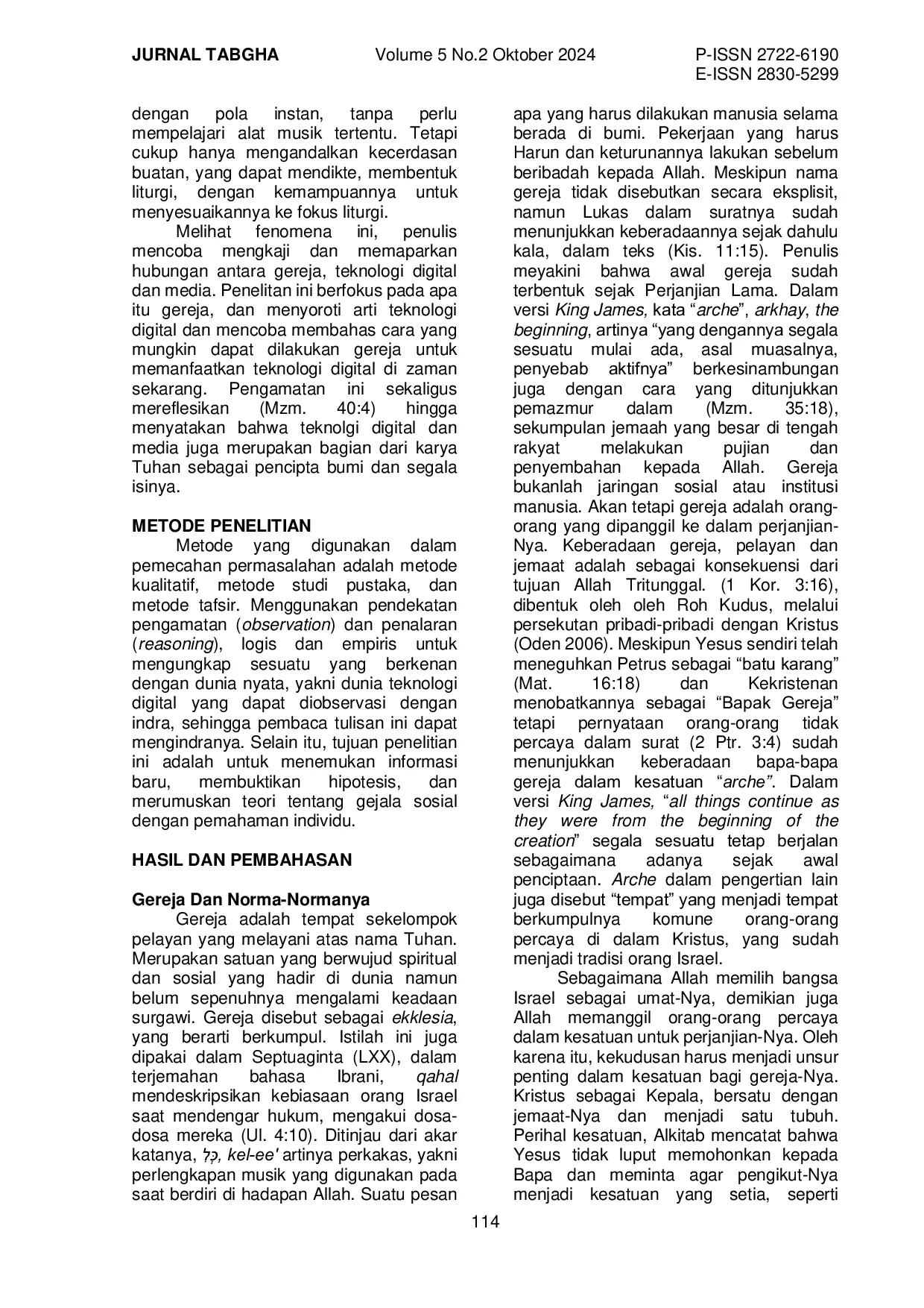JURNAL TABGHAJURNAL TABGHAKini, eksistensi digital bergerak kian cepat di antara kesibukan milyaran manusia. Bersamanya, tiap individu terintegrasi. Di sisi lain konsep digital terus bertransformasi dan menyita perhatian setiap orang. Banyak literasi membahas sisi baik, tantangan dan peluang digital terhadap manusia dan generasinya. Ditambah lagi dengan inovasi mesin peniru yang fungsinya tidak jauh dari manusia. Namanya Artificial Intelligence (AI), mesin cerdas buatan manusia yang dirancang untuk mempermudah pekerjaan manusia. Terakhir, beberapa pendapat menyampaikan mesin ini akan menjadi ancaman besar jika tidak dikelola dengan baik. Dalam tulisan ini penulis akan menjelaskan eksistensi digital AI dari perspektif Kekristenan. Karena mau-tidak-mau gereja harus menerima dan menerapkan teknologi dan media AI dalam pelayanannya untuk memperbaiki dunia yang sedang rusak. Akan tetapi kemodernan teknologi akan mengingkari keilahiran Tuhan ketika berada di tangan yang salah dengan motivasi yang salah. Daud dalam gubahannya di (Mazmur 40:4), mengingatkan bahwa Tuhanlah pencipta segala kebaikan untuk kemuliaan nama-Nya, bukan untuk merusak ciptaan-Nya. Dalam pengertian lain, digital dirancang bukan untuk kejatuhan manusia ke dalam dosa, tetapi sebaliknya untuk karya keselamatan melalui penebusan yang Dia berikan. Guna menghindari kesalahpahaman keberadaan digitalisasi, penulis akan memperjelas konsep digital dalam musik gereja dengan memberikan gambaran umum terhadap teori yang berkembang.