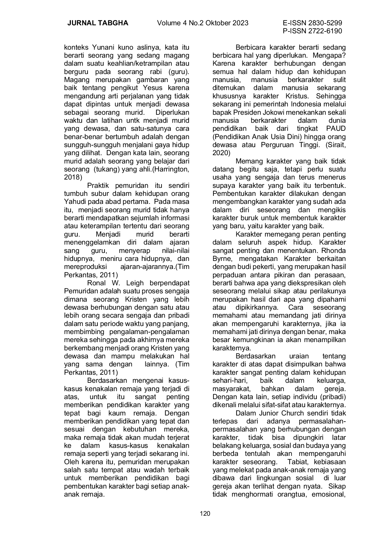 JURNAL TABGHAJURNAL TABGHAMasalah yang dihadapi saat ini adalah adanya kemerosotan karakter pada anak-anak remaja yang ada di junior church. Kita sadar bahwa saat ini sebagian besar anak-anak remaja mengalami masalah krisiskarakter, mereka tidak terkontrol oleh pengaruh perkembangan zaman ini. Karena itu sangat diperlukan peran dari pihak gereja dalam mengontrol permasalahan karakter yang ada. Oleh karena itu sangat penting bagi anak-anak remaja untuk dimuridkan agar memiliki karakter Kristus yang membawa pengaruh dalam kehidupan bersosialisasi. Melihat masalah yang ada, maka tujuan dari penelitian ini adalah mendeskripsikan pemuridan sebagai upaya proses pembentukan karakter kepada anak-anak remaja yang ada di Junior Church. Metode yang digunakan dalam penelitian ini adalah kualitatif. Pengumpulan data melalui observasi dan wawancara. Keseluruhan partisipan dapat memahami dan ikut serta dalam proses pemuridan yang berlangsung dengan pemberian teladan hidup oleh pengikut Kristus. Dari hasil penelitian, ditemukan bahwa pemuridan yang dilakukan di Junior Church berdampak membentuk karakter anak-anak remaja sehingga mereka memiliki nilai-nilai dan karakter yang mencerminkan Kristus didalamnya.