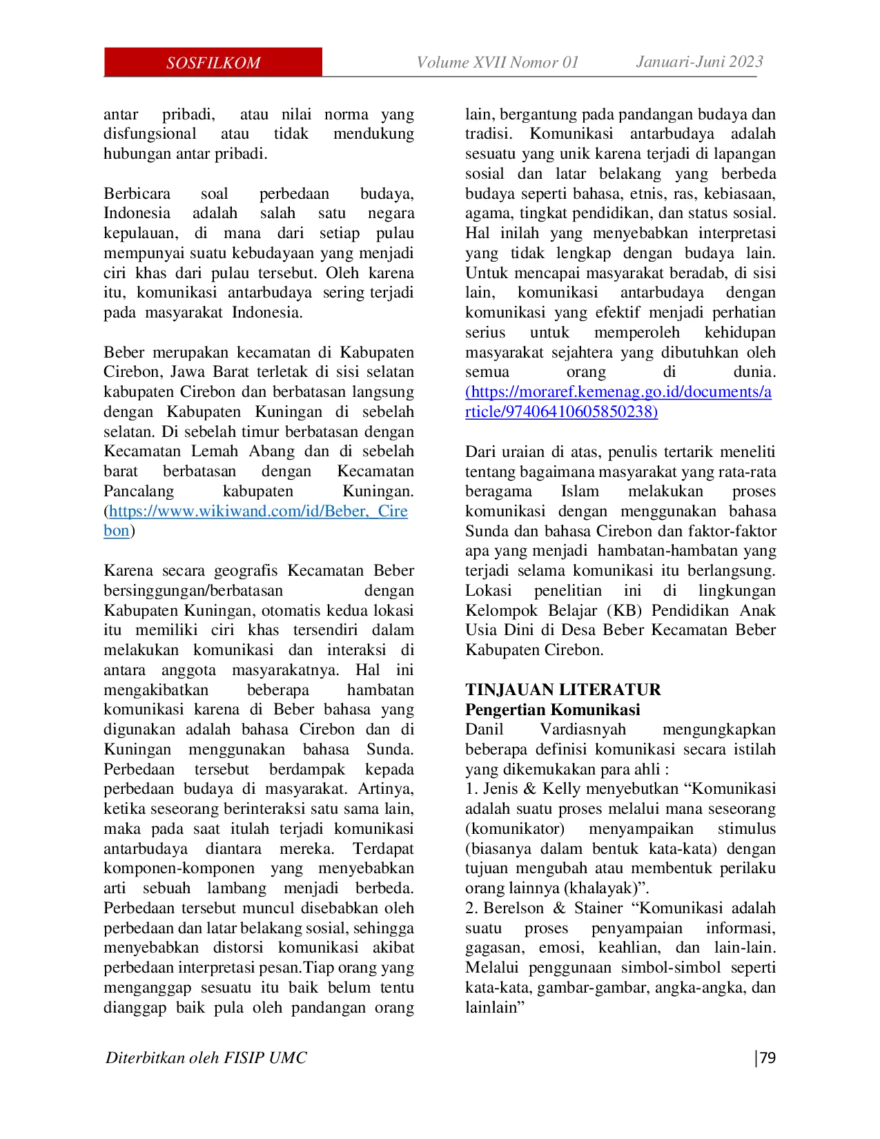 SOSFILKOM : Jurnal Sosial, Filsafat dan KomunikasiSOSFILKOM : Jurnal Sosial, Filsafat dan KomunikasiPenelitian ini bertujuan untuk mengetahui bagaimana proses komunikasi antarbudaya di lingkungan Kelompok Belajar (KB) Pendidikan Anak Usia Dini (PAUD), serta mengetahui apa saja faktor-faktor yang menghambatnya. Lokasi penelitian ini di Desa Beber Kecamatan Beber Kabupaten Cirebon, merupakan tempat yang berbatasan dengan Kabupaten Kuningan dengan latar belakang budaya yang berbeda. Dipaparkan secara deskriptif kualitatif. Tujuannya untuk memaparkan fakta yang telah ditemukan secara sistematis, aktual dan faktual, yang memandang bahwa hanya peneliti yang benar-benar bebas dan berbeda di luar lingkungan sasaran penelitian, dan menghasilkan kesimpulan yang obyektif. Penelitian ini berfokus mengenai bagaimana proses komunikasi dan apa saja faktor hambatan komunikasi yang ada di lingkungan PAUD. Hasil penelitian dalam proses komunikasi antarbudaya yang terjadi di lingkungan Kelompok Belajar Pendidikan Anak Usia Dini (KB PAUD) An Nur adalah: 1. Komunikasi yang dilakukan biasanya melalui tahap adaptasi dulu. Jika komunikasi mengalami hambatan atau buntu karena perbedaan bahasa, mereka menggunakan bahasa Indonesia sebagai jembatan pemersatu sehingga komunikasi bisa lebih efektif dan pesan yang disampaikan sesuai yang diinginkan. 2. Murid-murid KB PAUD An Nur dalam interaksinya dengan teman sebaya menggunakan bahasa campuran Sunda dan Cirebon. 3. Guru yang mengajar di KB PAUD An Nur saat mengajar di kelas menggunakan bahasa Indonesia sebagai bahasa pengantar pelajaran. Tapi saat berinteraksi informal mengikuti gaya bahasa anak-anak didiknya, bahasa Sunda dan bahasa Cirebon. 4. Komunikasi yang terjadi lingkungan KB PAUD An Nur, seperti juga secara umum di Desa Beber, Kecamatan Beber mengalami percampuran (akulturasi) budaya Jawa Cirebon dan Sunda Kuningan sehingga penggunaan bahasanya unik . 5. Berbaurnya bahasa dan budaya dalam lingkungan pendidikan menjadikan salah satu kekayaan dalam khasanah budaya di Indonesia, terutama dalam pembangunan masyarakat berbasis pendidikan Islam.