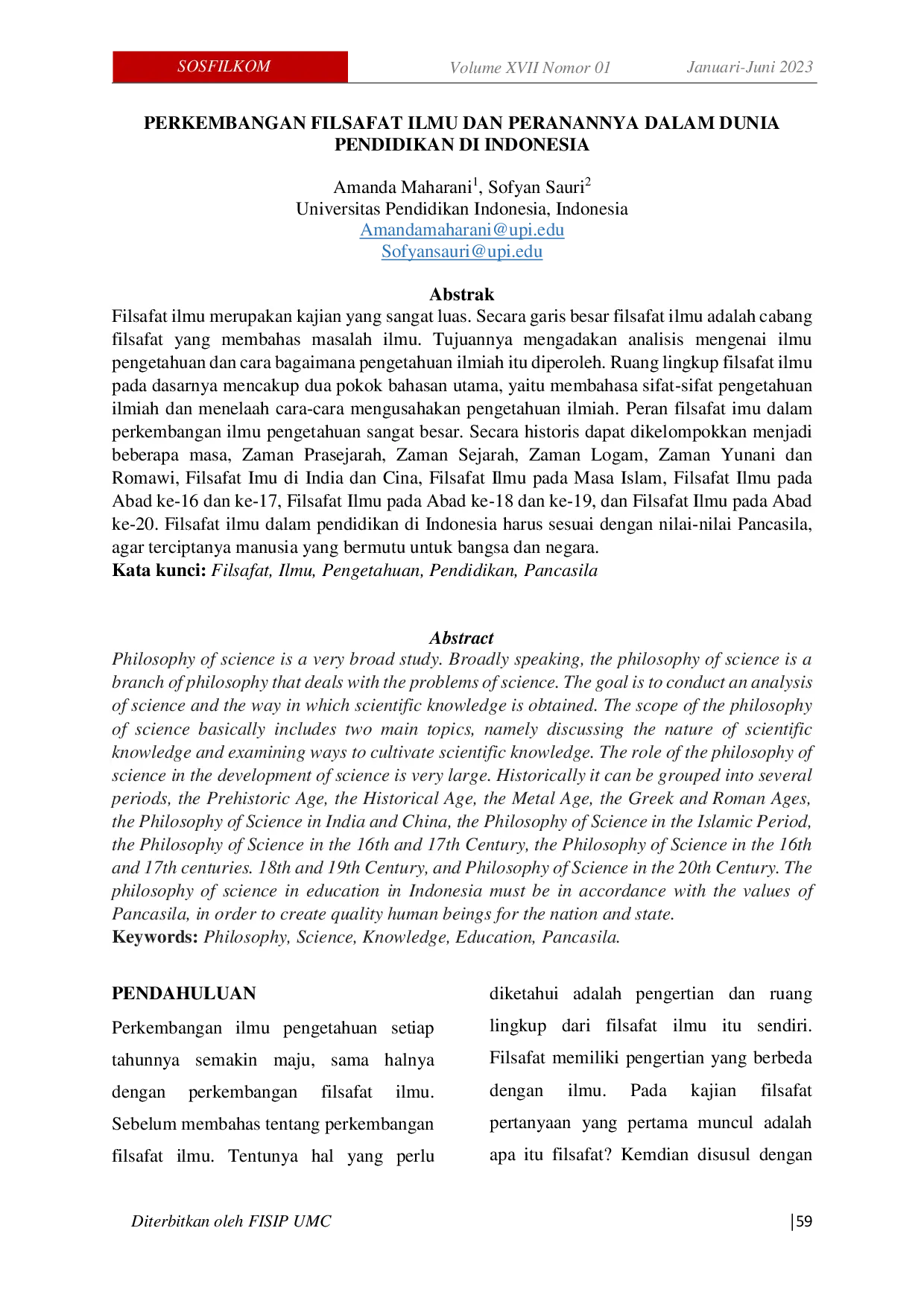 SOSFILKOM : Jurnal Sosial, Filsafat dan KomunikasiSOSFILKOM : Jurnal Sosial, Filsafat dan KomunikasiFilsafat ilmu merupakan kajian yang sangat luas. Secara garis besar filsafat ilmu adalah cabang filsafat yang membahas masalah ilmu. Tujuannya mengadakan analisis mengenai ilmu pengetahuan dan cara bagaimana pengetahuan ilmiah itu diperoleh. Ruang lingkup filsafat ilmu pada dasarnya mencakup dua pokok bahasan utama, yaitu membahasa sifat-sifat pengetahuan ilmiah dan menelaah cara-cara mengusahakan pengetahuan ilmiah. Peran filsafat ilmu dalam perkembangan ilmu pengetahuan sangat besar. Secara historis dapat dikelompokkan menjadi beberapa masa, Zaman Prasejarah, Zaman Sejarah, Zaman Logam, Zaman Yunani dan Romawi, Filsafat Ilmu di India dan Cina, Filsafat Ilmu pada Masa Islam, Filsafat Ilmu pada Abad ke-16 dan ke-17, Filsafat Ilmu pada Abad ke-18 dan ke-19, dan Filsafat Ilmu pada Abad ke-20. Filsafat ilmu dalam pendidikan di Indonesia harus sesuai dengan nilai-nilai Pancasila, agar terciptanya manusia yang bermutu untuk bangsa dan negara.