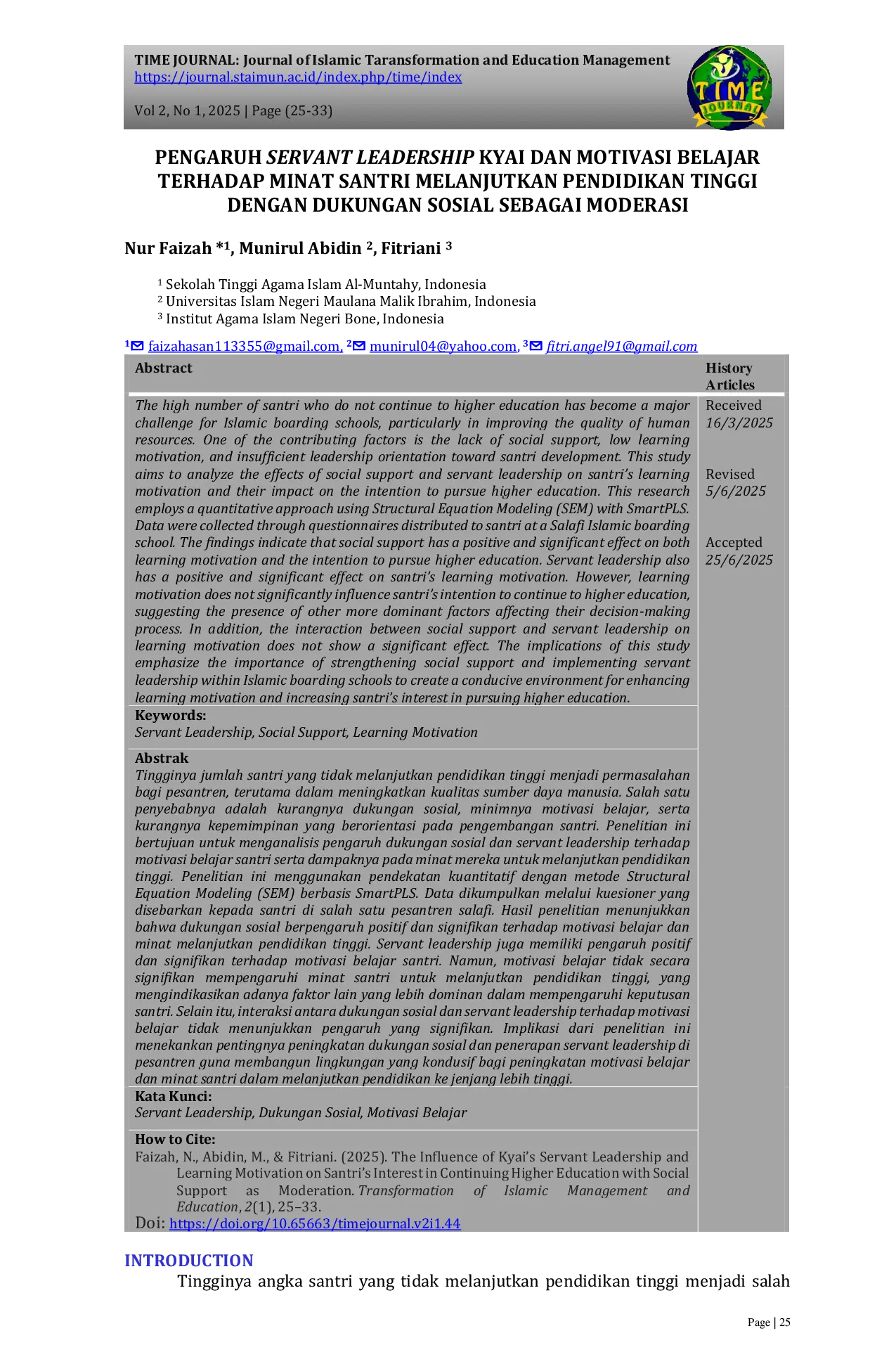 TIME Journal: Transformation of Islamic Management and Education JournalTIME Journal: Transformation of Islamic Management and Education JournalTingginya jumlah santri yang tidak melanjutkan pendidikan tinggi menjadi permasalahan bagi pesantren, terutama dalam meningkatkan kualitas sumber daya manusia. Salah satu penyebabnya adalah kurangnya dukungan sosial, minimnya motivasi belajar, serta kurangnya kepemimpinan yang berorientasi pada pengembangan santri. Penelitian ini bertujuan untuk menganalisis pengaruh dukungan sosial dan servant leadership terhadap motivasi belajar santri serta dampaknya pada minat mereka untuk melanjutkan pendidikan tinggi. Penelitian ini menggunakan pendekatan kuantitatif dengan metode Structural Equation Modeling (SEM) berbasis SmartPLS. Data dikumpulkan melalui kuesioner yang disebarkan kepada santri di salah satu pesantren salafi. Hasil penelitian menunjukkan bahwa dukungan sosial berpengaruh positif dan signifikan terhadap motivasi belajar dan minat melanjutkan pendidikan tinggi. Servant leadership juga memiliki pengaruh positif dan signifikan terhadap motivasi belajar santri. Namun, motivasi belajar tidak secara signifikan mempengaruhi minat santri untuk melanjutkan pendidikan tinggi, yang mengindikasikan adanya faktor lain yang lebih dominan dalam mempengaruhi keputusan santri. Selain itu, interaksi antara dukungan sosial dan servant leadership terhadap motivasi belajar tidak menunjukkan pengaruh yang signifikan. Implikasi dari penelitian ini menekankan pentingnya peningkatan dukungan sosial dan penerapan servant leadership di pesantren guna membangun lingkungan yang kondusif bagi peningkatan motivasi belajar dan minat santri dalam melanjutkan pendidikan ke jenjang lebih tinggi.
