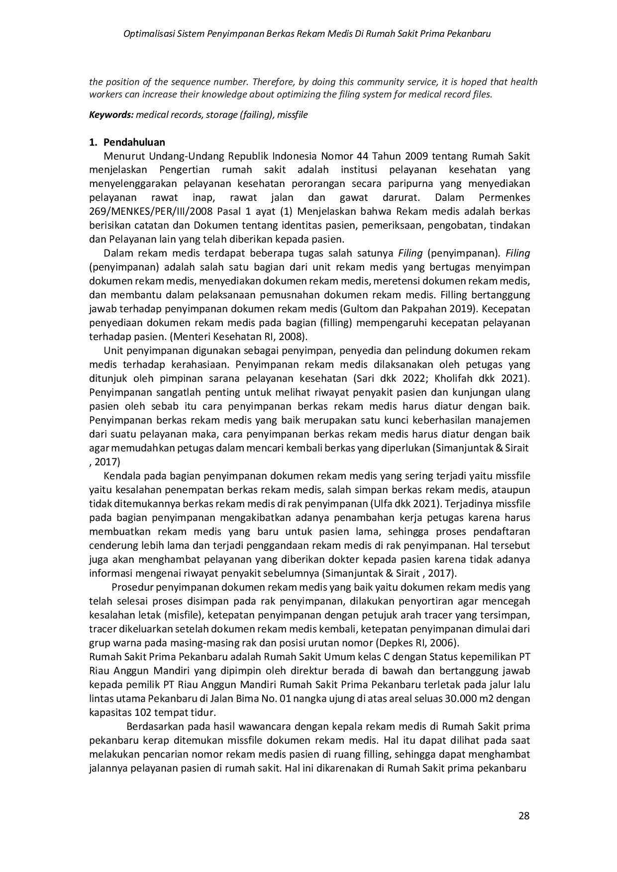 JKMI : Jurnal Kemitraan Masyarakat IndonesiaJKMI : Jurnal Kemitraan Masyarakat IndonesiaRekam medis adalah berkas berisi catatan dan dokumen antara lain identitas pasien, hasil pemeriksaan, pengobatan yang telah diberikan, serta tindakan dan pelayanan lain yang telah diberikan kepada pasien. Filing (penyimpanan) bertugas menyimpan dokumen rekam medis, menyediakan dokumen rekam medis, meretensi dokumen rekam medis, dan membantu dalam pelaksanaan pemusnahan rekam medis. Mitra dalam kegiatan pengabdian kepada masyarakat ini adalah Rumah Sakit Prima. Berdasarkan survey dan wawancara yang dilakukan ditemukan beberapa penyebab antaranya belum optimalnya pemberian kode warna, minimnya kapasitas penyimpanan, petugas belum pernah mengikuti pelatihan dan sosialisasi yang berkaitan tentang rekam medis, masih ada dokumen yang tidak ditemukan pencariannya. Tahapan pelaksanaan kegiatan PKM ini dilakukan dengan mengadopsi langkah-langkah action research yang terdiri dari 3 tahapan, yaitu: tahapan perancangan, pelatihan/penyuluhan, dan evaluasi. Hasil PKM ini didapat bahwa pemahaman petugas kesehatan setelah diberikannya penyuluhan mengalami peningkatan yaitu 90% petugas kesehatan sudah memahami dan mengetahui tentang sistem penyimpanan (filling) berkas rekam medis, prosedur penyimpanan rekam medis yang telah selesai proses disimpan pada rak penyimpanan, dilakukan penyortiran untuk mencegah kesalahan letak (missfile), ketetapan penyimpanan dengan petunjuk arah (tracer) yang tersimpan, tracer dikeluarkan setelah dokumen rekam medis kembali, ketepatan penyimpanan dimulai dari grup warna pada masing-masing rak dan posisis urutan nomor. Oleh karena itu, dengan dilakukannya pengabdian kepada masyarakat ini diharapkan agar petugas kesehatan dapat meningkatkan pengetahuannya tentang optimalisasi sistem penyimpanan (filing) berkas rekam medis.