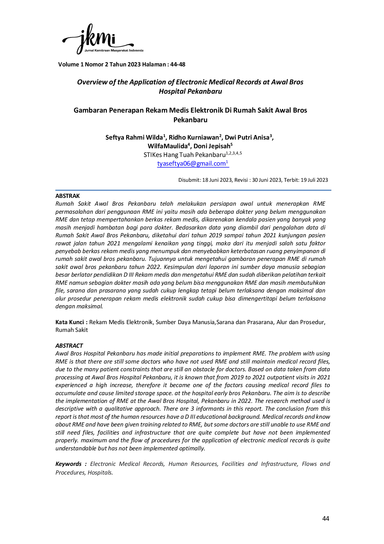 JKMI : Jurnal Kemitraan Masyarakat IndonesiaJKMI : Jurnal Kemitraan Masyarakat IndonesiaRumah Sakit Awal Bros Pekanbaru telah melakukan persiapan awal untuk menerapkan RME. Permasalahan dari penggunaan RME ini adalah masih ada beberapa dokter yang belum menggunakan RME dan tetap mempertahankan berkas rekam medis, dikarenakan kendala pasien yang banyak yang masih menjadi hambatan bagi para dokter. Berdasarkan data dari Rumah Sakit Awal Bros Pekanbaru, kunjungan pasien rawat jalan tahun 2021 mengalami kenaikan yang tinggi, menyebabkan penumpukan berkas rekam medis dan keterbatasan ruang penyimpanan. Penelitian ini bertujuan untuk mengetahui gambaran penerapan RME di rumah sakit Awal Bros Pekanbaru tahun 2022. Metode penelitian yang digunakan adalah deskriptif dengan pendekatan kualitatif. Hasil penelitian menunjukkan bahwa sebagian besar sumber daya manusia memiliki latar pendidikan D III Rekam medis dan mengetahui RME serta telah diberikan pelatihan terkait RME, namun sebagian dokter masih belum mampu menggunakan RME dan masih membutuhkan file fisik. Sarana dan prasarana sudah cukup lengkap tetapi belum terlaksana dengan maksimal, dan alur prosedur penerapan rekam medis elektronik sudah cukup dimengerti tetapi belum terlaksana secara optimal.