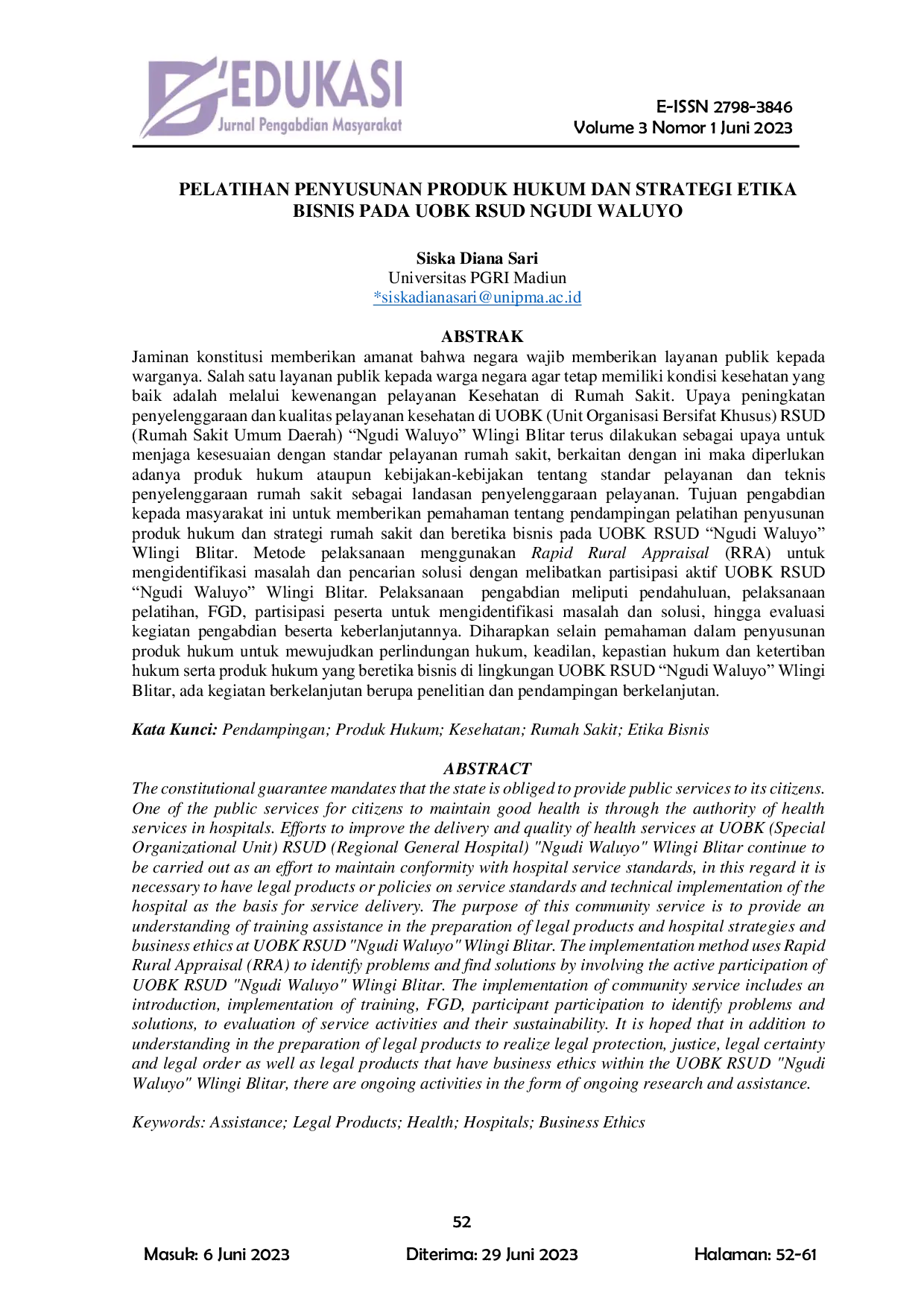 D'edukasi: Jurnal Pengabdian MasyarakatD'edukasi: Jurnal Pengabdian MasyarakatJaminan konstitusi memberikan amanat bahwa negara wajib memberikan layanan publik kepada warganya, salah satunya adalah melalui pelayanan kesehatan di rumah sakit. Upaya peningkatan penyelenggaraan dan kualitas pelayanan kesehatan di UOBK RSUD Ngudi Waluyo Wlingi Blitar terus dilakukan, dan diperlukan adanya produk hukum atau kebijakan tentang standar pelayanan dan teknis penyelenggaraan rumah sakit sebagai landasan penyelenggaraan pelayanan. Tujuan pengabdian kepada masyarakat ini adalah memberikan pemahaman tentang pendampingan pelatihan penyusunan produk hukum dan strategi rumah sakit serta etika bisnis pada UOBK RSUD Ngudi Waluyo Wlingi Blitar. Metode yang digunakan adalah Rapid Rural Appraisal (RRA) untuk mengidentifikasi masalah dan mencari solusi dengan melibatkan partisipasi aktif UOBK RSUD Ngudi Waluyo Wlingi Blitar.