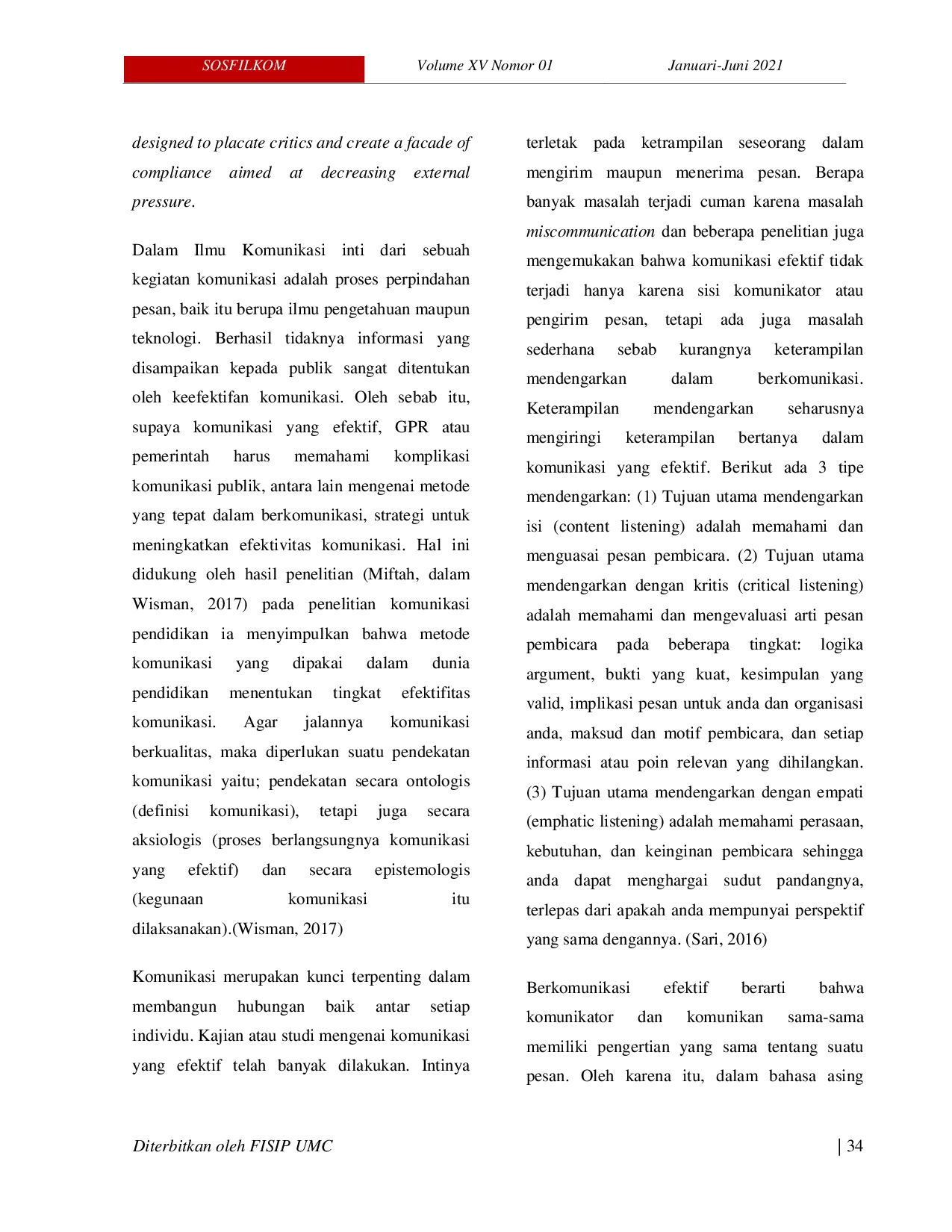 SOSFILKOM : Jurnal Sosial, Filsafat dan KomunikasiSOSFILKOM : Jurnal Sosial, Filsafat dan KomunikasiPenelitian ini bertujuan untuk menjelaskan respon milenial terhadap komunikasi publik pemerintah mengenai kebijakan Omnibus Law. Salah satu fungsi komunikasi publik adalah membentuk dan meningkatkan citra. Dalam proses pembentukan tersebut tentu diperlukan pemahaman informasi yang efektif dan benar sehingga apa yang disampaikan oleh komunikator bisa sama persepsinya dengan komunikan atau khalayak. Penelitian ini menggunakan metode kuantitatif kepada 300 orang mahasiswa yang tersebar di Provinsi DKI Jakarta untuk melihat seberapa besar pengaruh komunikasi publik pemerintah mengenai kebijakan Omnibus Law. Teknik pengumpulan data menggunakan kuesioner. Analisis dan pengolahan data menggunakan SPSS. Hasil penelitian menunjukkan bahwa respon milenial terhadap komunikasi publik pemerintah mengenai kebijakan Omnibus Law paling tinggi adalah perhatian atau attention dan paling rendah adalah di pengambilan keputusan atau decision. Kesimpulan penelitian ini adalah komunikasi publik pemerintah harus dimaksimalkan sehingga semua aspek dalam komunikasi publik tersampaikan dengan baik dan efektif.