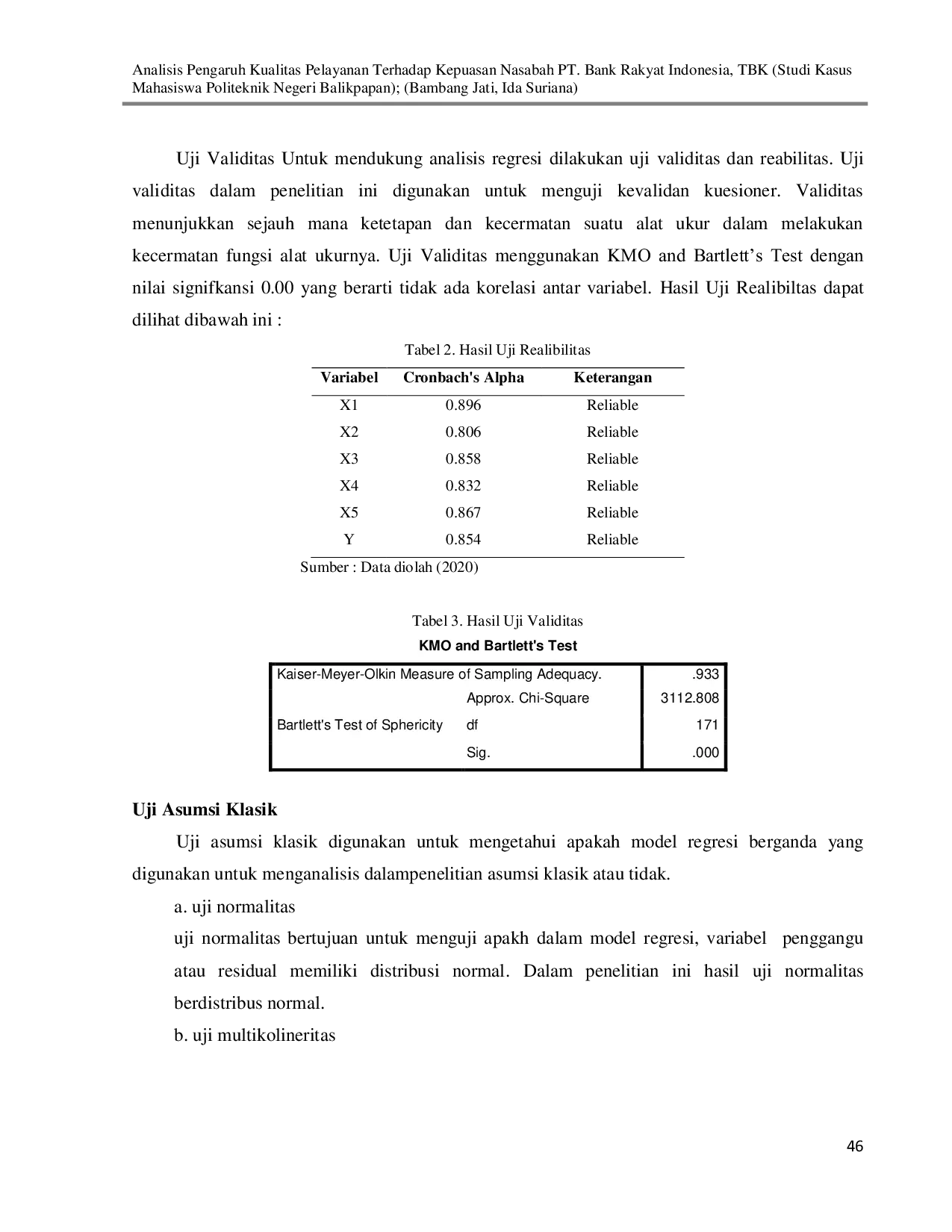 Dari hasil pembahasan yang sudah ada maka dapat ditarik kesimpulan bahwa secara simultan variabel kualitas pelayanan berpengaruh secara simultan terhadap kepuasan nasabah.Dari hasil penelitian ini agar dapat mendorong Bank BRI untuk dapat meningkatkan kualitas pelayanan yang diberikan bagi nasabah-nasabah potensial seperti mahasiswa agar dikemudiaan hari, ketika mahasiswa sudah mulai bekerja akan tetap menjadi nasabah yang setia menggunakan produk-produk yang dikeluarkan oleh bank BRI.Hal ini sesuai dengan penelitan yang dilakukan oleh Ahmaddien (2016).Dari lima variabel independen terdapat dua variabel yang berpengaruh secara parsial terhadap kepuasan nasabah yaitu responsiveness (daya tanggap) dan emphaty (kepedulian).