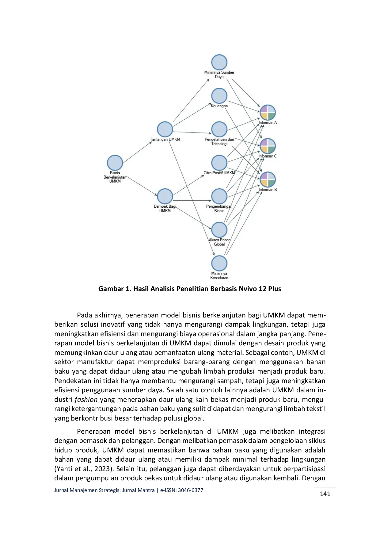 Jurnal Manajemen Strategis: Jurnal MantraJurnal Manajemen Strategis: Jurnal MantraPenelitian ini bertujuan untuk mengelaborasi konsep bisnis berkelanjutan dalam konteks pegiat Usaha Mikro, Kecil, dan Menengah (UMKM). UMKM berperan penting bagi penguatan perekonomian nasional, sehingga dibutuhkan konsep keberlanjutan bisnis dalam menghadapi tantangan ekonomi, sosial, dan lingkungan. Penelitian ini melibatkan tiga subjek yang merupakan pegiat UMKM yang memiliki kepedulian terhadap aspek lingkungan dan sosial. Penelitian ini menggunakan pendekatan studi fenomenologi dengan metode analisis Interpretative Phenomenological Analysis. Data diperoleh melalui metode wawancara mendalam (in-depth interview) dan observasi dengan kategori berbasis pernyataan subjek penelitian yang merupakan pegiat UMKM di Kabupaten Serang. Subjek penelitian menyatakan bahwa pegiat UMKM memiliki pemahaman yang beragam tentang bisnis berkelanjutan, yang mencakup aspek efisiensi sumber daya, tanggung jawab sosial dan lingkungan. Praktik berkelanjutan lebih banyak muncul dari kebutuhan praktis, seperti penghematan biaya dan peningkatan daya saing, dibandingkan dengan motivasi lingkungan atau sosial yang lebih strategis. Penelitian ini menemukan bahwa meski menemui banyak tantangan, tetapi pegiat UMKM sudah memahami konsep bisnis berkelanjutan dapat memberikan dampak positif bagi pengembangan bisnis UMKM di era yang semakin kompetitif.