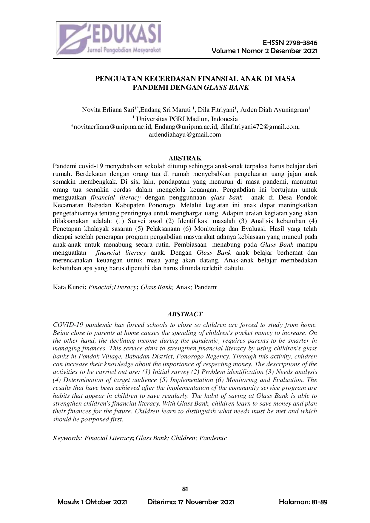 D'edukasi: Jurnal Pengabdian MasyarakatD'edukasi: Jurnal Pengabdian MasyarakatPandemi covid-19 menyebabkan sekolah ditutup sehingga anak-anak terpaksa harus belajar dari rumah. Berdekatan dengan orang tua di rumah menyebabkan pengeluaran uang jajan anak semakin membengkak. Di sisi lain, pendapatan yang menurun di masa pandemi, menuntut orang tua semakin cerdas dalam mengelola keuangan. Pengabdian ini bertujuan untuk menguatkan financial literacy dengan penggunaan glass bank anak di Desa Pondok Kecamatan Babadan Kabupaten Ponorogo. Melalui kegiatan ini anak dapat meningkatkan pengetahuannya tentang pentingnya untuk menghargai uang. Adapun uraian kegiatan yang akan dilaksanakan adalah: (1) Survei awal (2) Identifikasi masalah (3) Analisis kebutuhan (4) Penetapan khalayak sasaran (5) Pelaksanaan (6) Monitoring dan Evaluasi. Hasil yang telah dicapai setelah penerapan program pengabdian masyarakat adanya kebiasaan yang muncul pada anak-anak untuk menabung secara rutin. Pembiasaan menabung pada Glass Bank mampu menguatkan financial literacy anak. Dengan Glass Bank anak belajar berhemat dan merencanakan keuangan untuk masa yang akan datang. Anak-anak belajar membedakan kebutuhan apa yang harus dipenuhi dan harus ditunda terlebih dahulu.