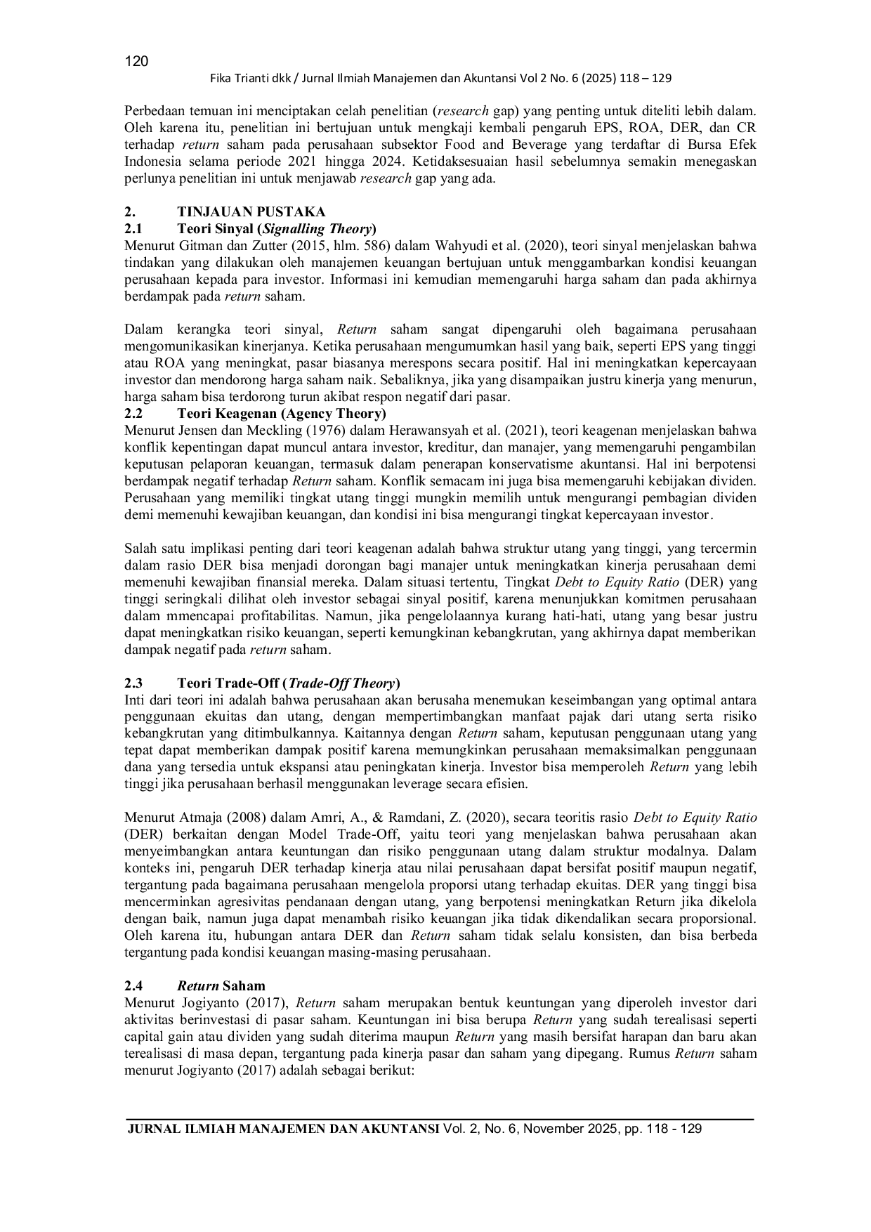 Jurnal Ilmiah Manajemen dan AkuntansiJurnal Ilmiah Manajemen dan AkuntansiPenelitian ini bertujuan untuk menganalisis Earning Per Share (EPS), Return on Assets (ROA), Debt to Equity Ratio (DER), dan Current Ratio (CR) terhadap Return saham pada perusahaan sektor Consumer Non-Cyclicals subsektor Food and Beverage yang terdaftar di Bursa Efek Indonesia (BEI) periode 2021-2024. Metode penelitian yang digunakan adalah kuantitatif dengan pendekatan asosiatif. Teknik pengambilan sampel dilakukan dengan purposive sampling, menghasilkan 37 perusahaan sebagai sampel. Data yang digunakan merupakan data sekunder yang diperoleh dari laporan keuangan. Analisis data dilakukan menggunakan regresi linear berganda dengan bantuan software SPSS versi 25. Temuan penelitian ini menunjukkan bahwa secara parsial, variabel EPS memiliki pengaruh positif yang signifikan terhadap Return saham, ROA menunjukkan pengaruh negatif yang signifikan, sedangkan DER dan CR tidak menunjukkan pengaruh yang signifikan terhadap Return saham.