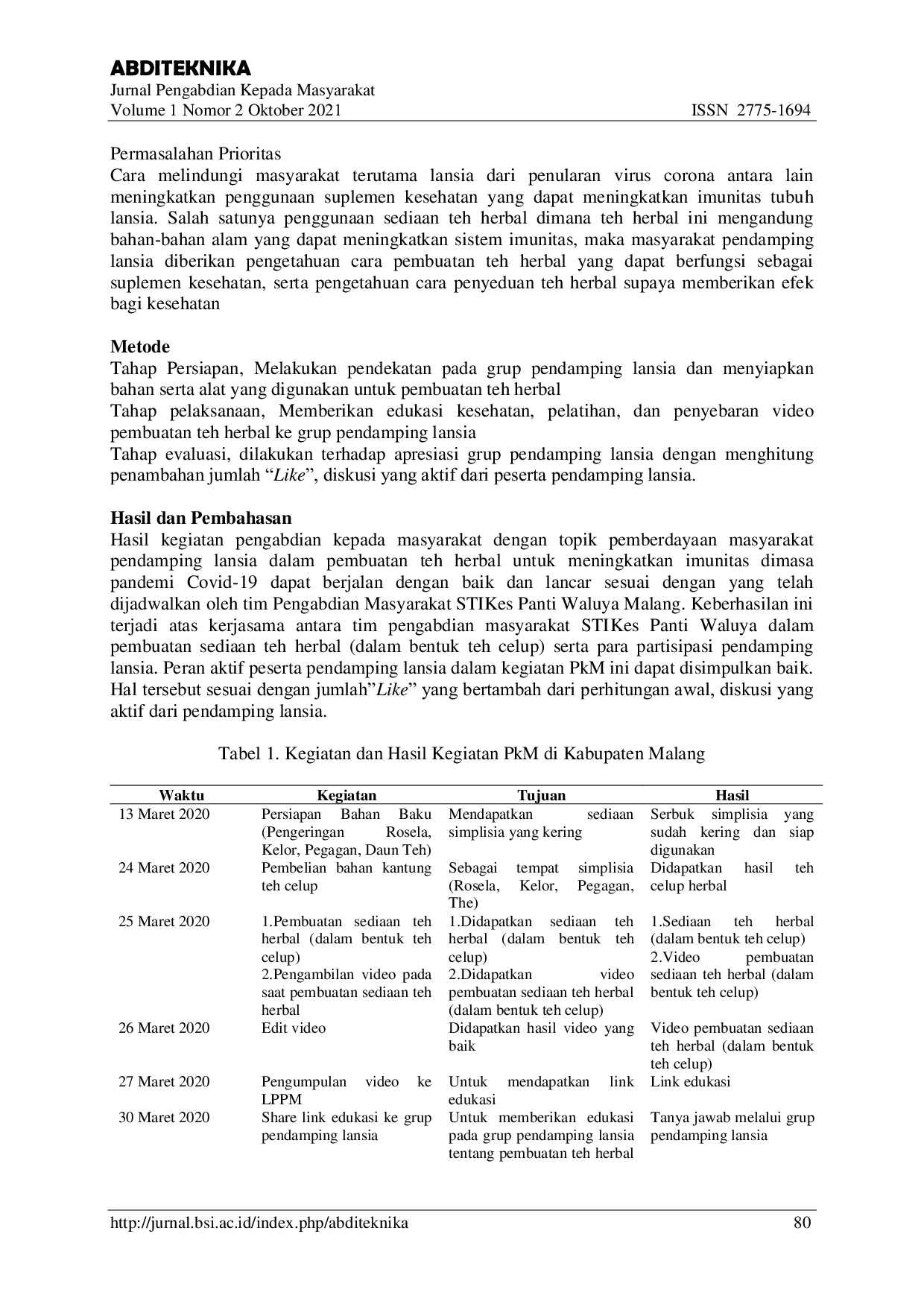 Abditeknika Jurnal Pengabdian MasyarakatAbditeknika Jurnal Pengabdian MasyarakatMasa pandemi Covid-19 menimbulkan banyak korban dan belum ditemukan obatnya. Pemerintah berupaya meningkatkan imunitas masyarakat melalui pola hidup sehat, termasuk konsumsi makanan sehat dan suplemen. Pengabdian masyarakat ini bertujuan meningkatkan kemampuan mengenalkan bahan-bahan herbal, takaran, kandungan, dan khasiatnya, serta meningkatkan pengetahuan masyarakat tentang manfaat teh herbal. Metode yang digunakan meliputi pendekatan pada grup pendamping lansia, persiapan bahan dan alat, edukasi kesehatan, pelatihan, penyebaran video pembuatan teh herbal, dan evaluasi apresiasi. Hasilnya menunjukkan peningkatan jumlah Like dan diskusi aktif dari peserta, mengindikasikan pelaksanaan berjalan baik dan sesuai jadwal.