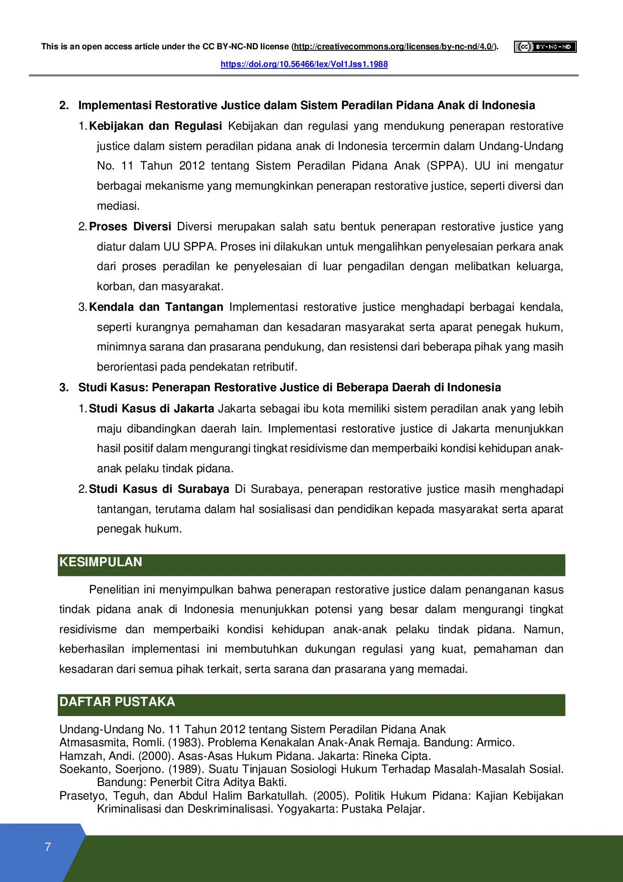 Penelitian ini menyimpulkan bahwa penerapan restorative justice dalam penanganan kasus tindak pidana anak di Indonesia menunjukkan potensi yang besar dalam mengurangi tingkat residivisme dan memperbaiki kondisi kehidupan anak-anak pelaku tindak pidana.Keberhasilan implementasi ini membutuhkan dukungan regulasi yang kuat, pemahaman dan kesadaran dari semua pihak terkait, serta sarana dan prasarana yang memadai.Penerapan restorative justice memerlukan sosialisasi yang lebih luas kepada masyarakat dan aparat penegak hukum untuk memastikan pemahaman yang komprehensif mengenai prinsip dan manfaatnya.Evaluasi berkala terhadap program restorative justice juga penting untuk mengidentifikasi area yang perlu ditingkatkan dan memastikan efektivitasnya.