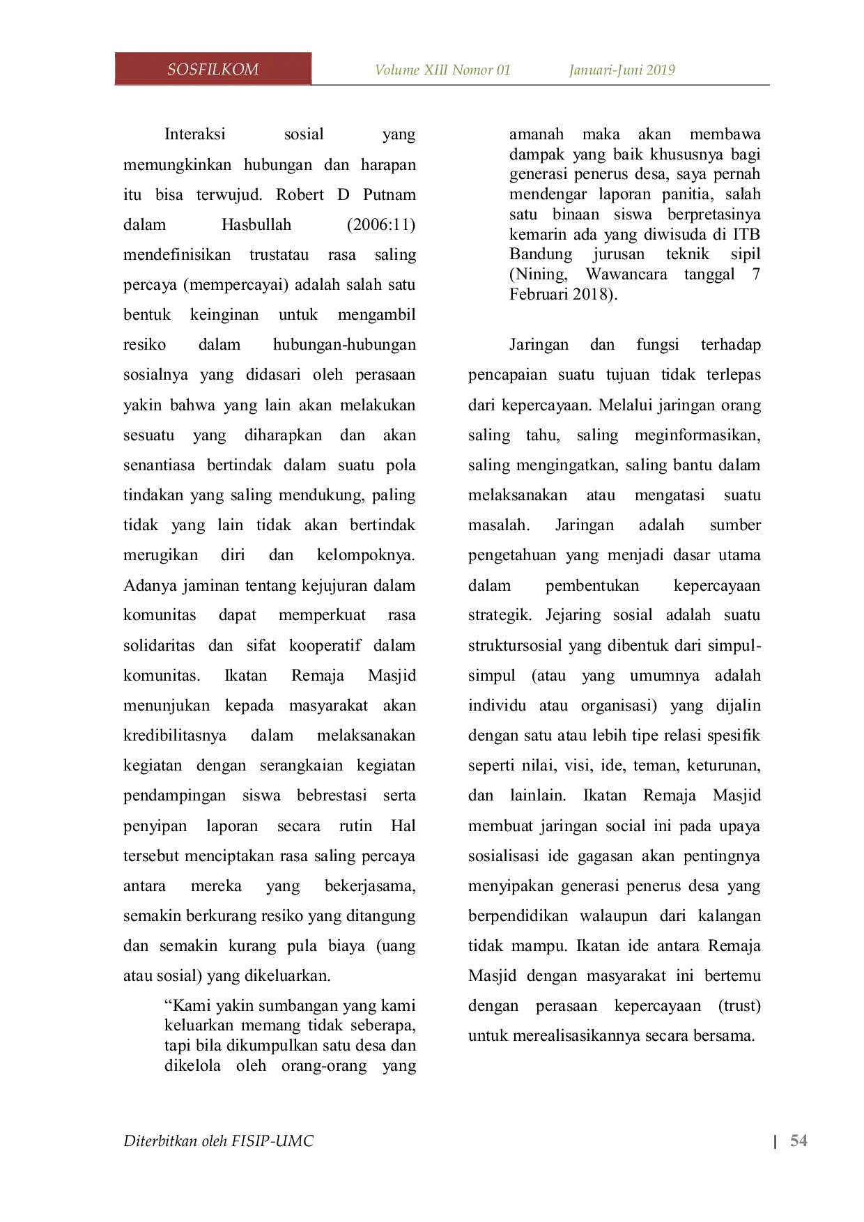 Kegiatan Jemput Duafa Berprestasi di Desa Klangenan yang menghimpun keswadayaan masyarakat desa dengan mengelola menunjukan eksistensi dan kredibilitas pengelola kegiatan malaui pembuatan laporan baik keuangan maupun laporan capaian kegiatan.Jaringan sosial yang terbangun berhasil menyatukan ide remaja masjid dan masyarakat tentang mimpi masa depan desa yang akan dititipkan pada generasi yang berpendidikan.Perasaan empati atas kesempatan yang harus diberikan kepada siswa-siswa dari keluarga tidak mampu pada akhirnya menghadirkan semacam kesepakatan moril masyarakat sebagai norma kebaikan.