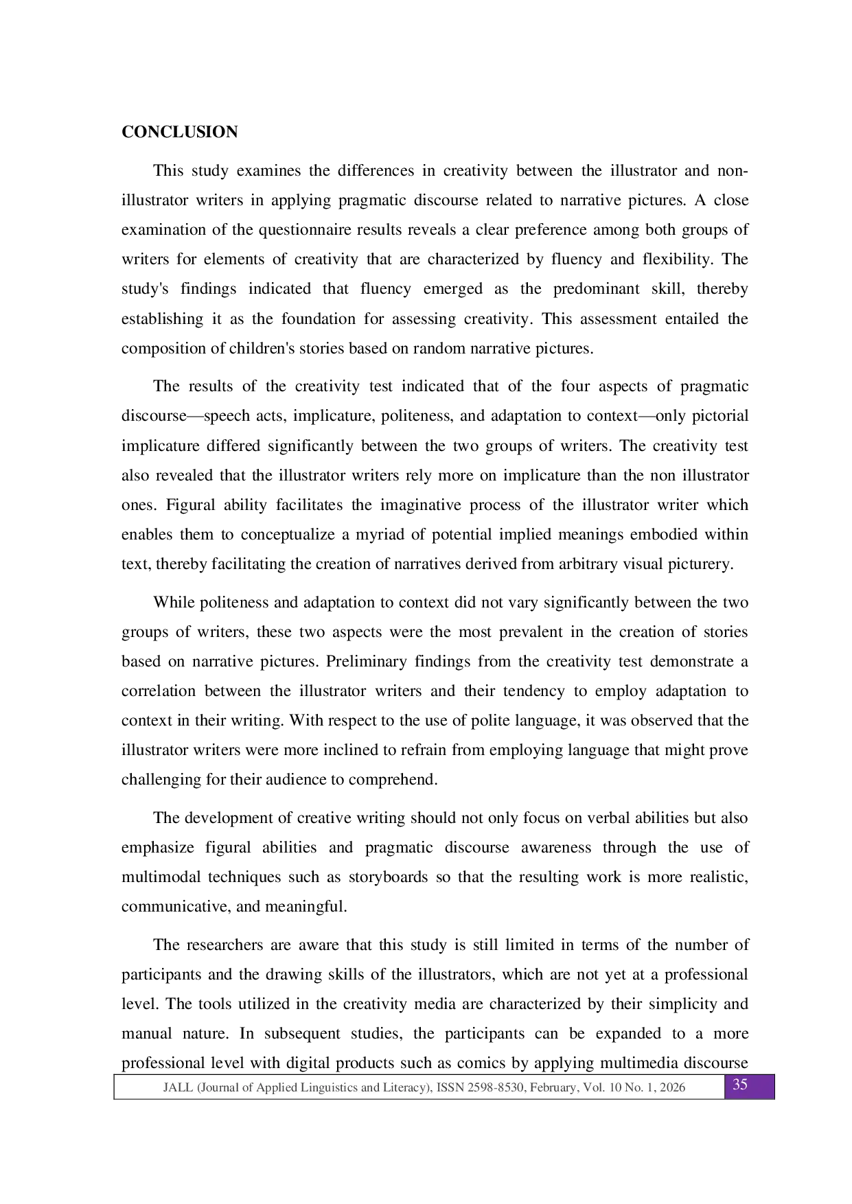 JALL (Journal of Applied Linguistics and Literacy)JALL (Journal of Applied Linguistics and Literacy)The present study examined creativity in shaping English-language childrens stories through instructions to arrange random pictures into narratives. The objectives of this study were to identify, i) significant differences in creativity in applying pragmatic discourse to narrative pictures between illustrator and non-illustrator writers; ii) how pragmatic discourse was applied to narrative pictures by both groups of writers; and iii) how narrative pictures were arranged. A total of 40 college students consisting of 20 illustrator writers and 20 non-illustrator writers participated in this study. The present study employed a mixed-method sequential explanatory design. The instruments used are the Mann-Whitney U test, questionnaires and interview The pragmatic approach through picDRT, in conjunction with Blum Kulkas pragmatic discourse, served to elucidate the problem. In the findings, picDRT supports pragmatic discourse, in which picDRT simulates the form of discourse representation by identifying referents and coherence, while pragmatic discourse integrates the functions of social and contextual meaning. Both demonstrate a pragmatic cognitive model for comprehensive understanding of discourse in the verbal and pictorial domains possessed by the story writers.