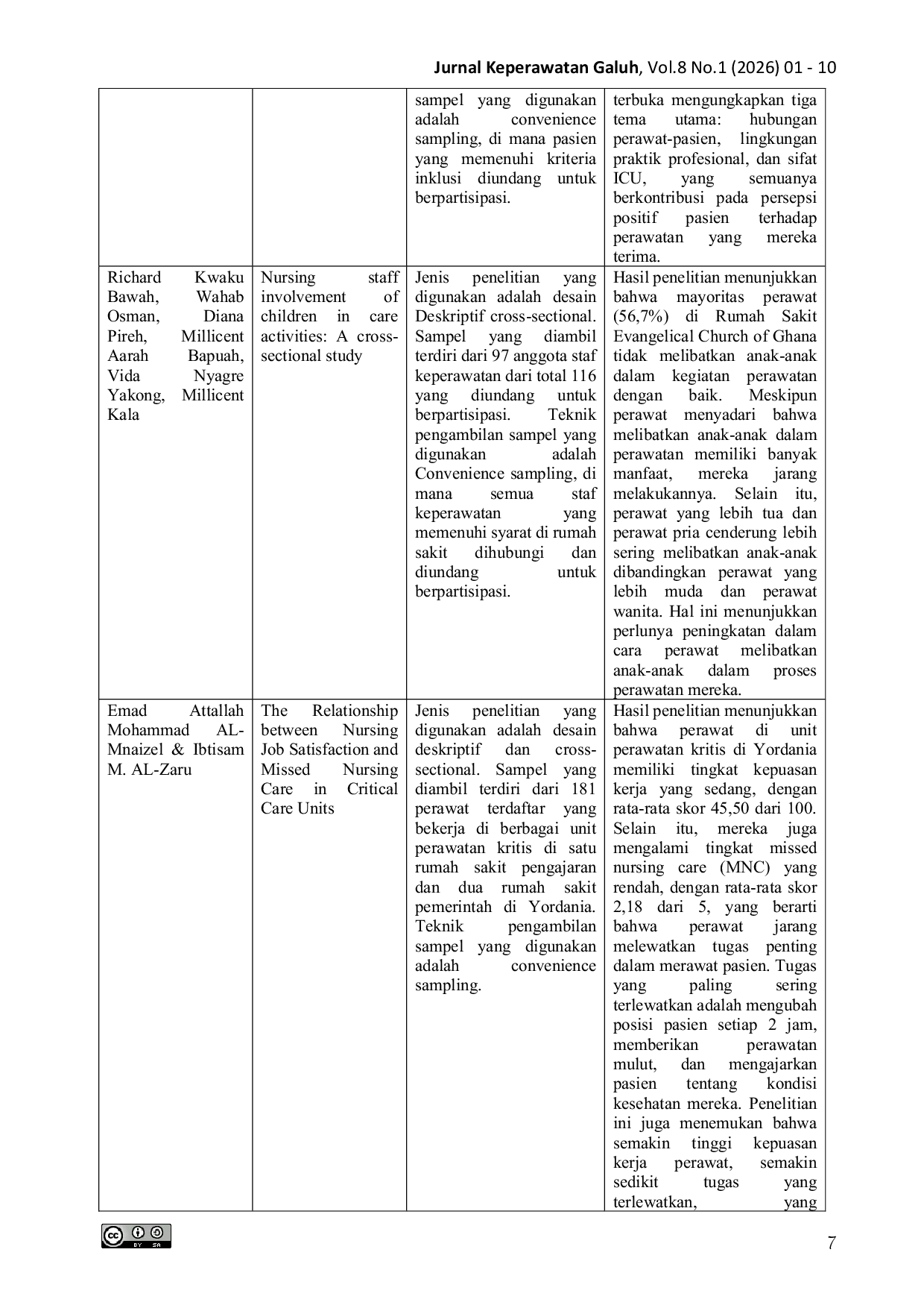 Jurnal Keperawatan GaluhJurnal Keperawatan GaluhKomunikasi efektif merupakan elemen penting dalam pelayanan keperawatan yang berkualitas, dan penerapan metode SBAR terbukti meningkatkan interaksi antar tenaga kesehatan. Penelitian ini menggunakan pendekatan literature review terhadap 11 artikel yang dipublikasikan antara tahun 2020–2025. Hasil sintesis menunjukkan bahwa 9 dari 11 studi (82%) melaporkan peningkatan signifikan dalam efektivitas komunikasi perawat-dokter setelah pelatihan SBAR, serta peningkatan keselamatan pasien melalui penurunan kesalahan medis dan keluhan pelayanan. Beberapa penelitian juga menunjukkan bahwa pelatihan SBAR mampu meningkatkan kepuasan kerja perawat dan keterlibatan pasien dalam proses perawatan. Namun demikian, implementasi SBAR di lapangan masih menghadapi kendala pada aspek pengetahuan dan konsistensi penggunaan. Diperlukan pelatihan berkelanjutan dan dukungan organisasi untuk mengoptimalkan manfaat SBAR dalam praktik klinis.