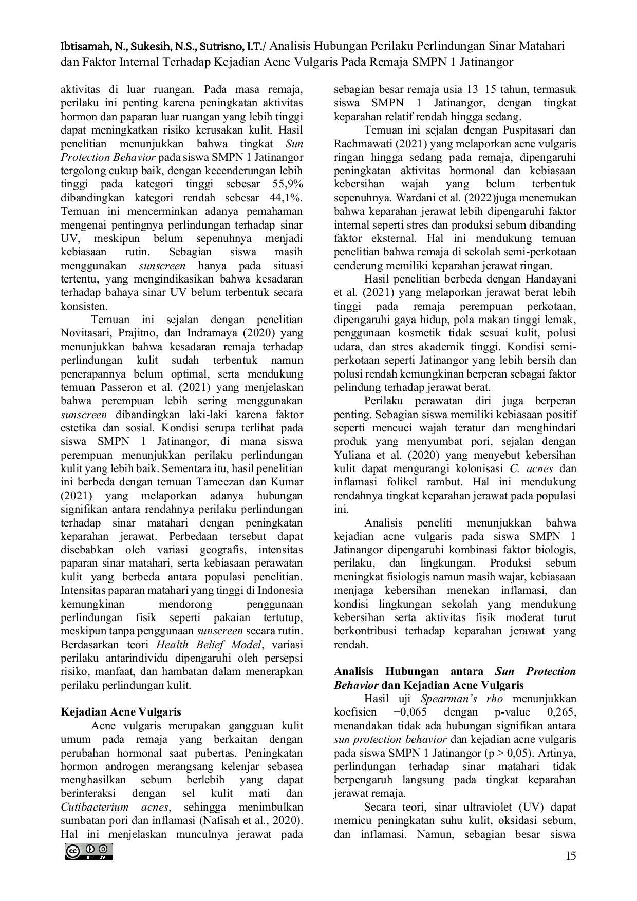 Jurnal Keperawatan GaluhJurnal Keperawatan GaluhJerawat merupakan masalah kulit yang umum terjadi pada remaja dan dapat memengaruhi kepercayaan diri serta kesehatan kulit. Salah satu faktor eksternal yang diduga berperan terhadap timbulnya jerawat adalah perilaku perlindungan terhadap sinar matahari (sun protection behavior), yang mencakup penggunaan tabir surya, pakaian pelindung, serta kebiasaan menghindari paparan sinar matahari langsung. Penelitian ini bertujuan untuk mengetahui hubungan antara sun protection behavior dengan kejadian acne vulgaris pada siswa Sekolah Menengah Pertama di Jatinangor. Penelitian ini menggunakan metode kuantitatif dengan desain analitik korelasional dan pendekatan cross-sectional. Penelitian dilaksanakan di SMPN 1 Jatinangor pada tahun 2025 dengan jumlah responden sebanyak 295 siswa yang dipilih menggunakan teknik stratified random sampling. Instrumen penelitian meliputi kuesioner Sun Protection Behavior Scale (SPBS) dan kuesioner Global Acne Grading Systems (GAGS). Analisis data dilakukan menggunakan uji korelasi Spearman. Hasil penelitian menunjukkan bahwa sebagian besar siswa memiliki perilaku perlindungan terhadap sinar matahari dalam kategori tinggi dan mengalami jerawat dalam kategori ringan. Hasil uji Spearman menunjukkan nilai r = −0,065 dan p = 0,265, yang berarti tidak terdapat hubungan yang signifikan antara sun protection behavior dengan kejadian acne vulgaris. Dapat disimpulkan bahwa munculnya jerawat lebih banyak dipengaruhi oleh faktor internal, seperti perubahan hormon dan kebersihan wajah, dibandingkan faktor eksternal berupa paparan sinar matahari. Diperlukan edukasi berkelanjutan mengenai perawatan kulit agar kesadaran remaja dalam menjaga kesehatan kulit dapat meningkat sejak dini.