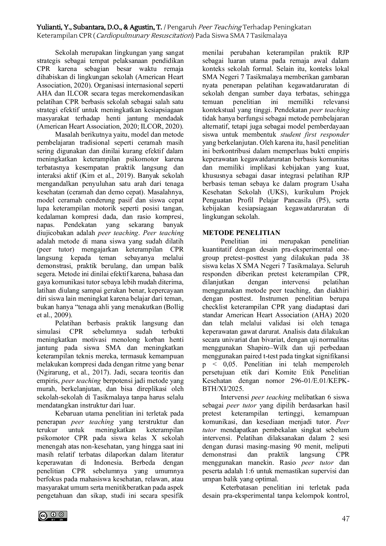 Jurnal Keperawatan GaluhJurnal Keperawatan GaluhHenti jantung mendadak merupakan salah satu penyebab utama kematian di dunia dan memerlukan tindakan pertolongan segera berupa Cardiopulmonary Resuscitation (CPR) oleh saksi awam. Namun, keterampilan CPR pada remaja sekolah masih tergolong rendah. Metode peer teaching dipandang sebagai pendekatan pembelajaran yang efektif untuk meningkatkan keterampilan psikomotor melalui interaksi teman sebaya. Penelitian ini bertujuan untuk mengetahui pengaruh metode peer teaching terhadap peningkatan keterampilan CPR pada siswa SMA Negeri 7 Tasikmalaya. Penelitian menggunakan desain kuantitatif pra-eksperimental dengan pendekatan one-group pretest–posttest pada 38 siswa kelas X yang dipilih secara purposive. Instrumen penelitian berupa checklist keterampilan CPR yang mengacu pada standar American Heart Association (AHA) 2020. Analisis data meliputi uji normalitas Shapiro–Wilk dan uji paired t-test. Hasil penelitian menunjukkan peningkatan nilai rata-rata keterampilan CPR pada posttest dibandingkan pretest, dengan perbedaan yang signifikan secara statistik (p < 0,001) dan effect size yang sangat besar (Cohens d = 1,98). Disimpulkan bahwa metode peer teaching efektif dalam meningkatkan keterampilan CPR pada siswa SMA.