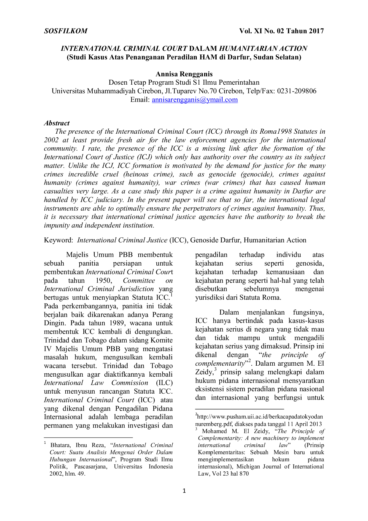 SOSFILKOM : Jurnal Sosial, Filsafat dan KomunikasiSOSFILKOM : Jurnal Sosial, Filsafat dan KomunikasiKehadiran International Criminal Court (ICC) melalui Statuta Roma 1998 pada tahun 2002 setidaknya memberikan angin segar bagi penegakan hukum di tingkat internasional. Kehadiran ICC merupakan pelengkap setelah pembentukan International Court of Justice (ICJ) yang hanya memiliki yurisdiksi atas negara sebagai subjeknya. Berbeda dengan ICJ, pembentukan ICC didorong oleh tuntutan keadilan atas kejahatan-kejahatan yang sangat kejam (kejahatan heinous), seperti genosida, kejahatan terhadap kemanusiaan, dan kejahatan perang yang telah menyebabkan korban jiwa yang sangat besar. Sebagai studi kasus, makalah ini membahas kejahatan terhadap kemanusiaan di Darfur yang ditangani oleh peradilan ICC. Dalam makalah ini akan dilihat bahwa sejauh ini, instrumen hukum internasional mampu menjerat pelaku kejahatan terhadap kemanusiaan secara optimal. Oleh karena itu, diperlukan lembaga penegak keadilan pidana internasional yang memiliki wewenang untuk memecahkan impunitas dan menjadi institusi yang independen.