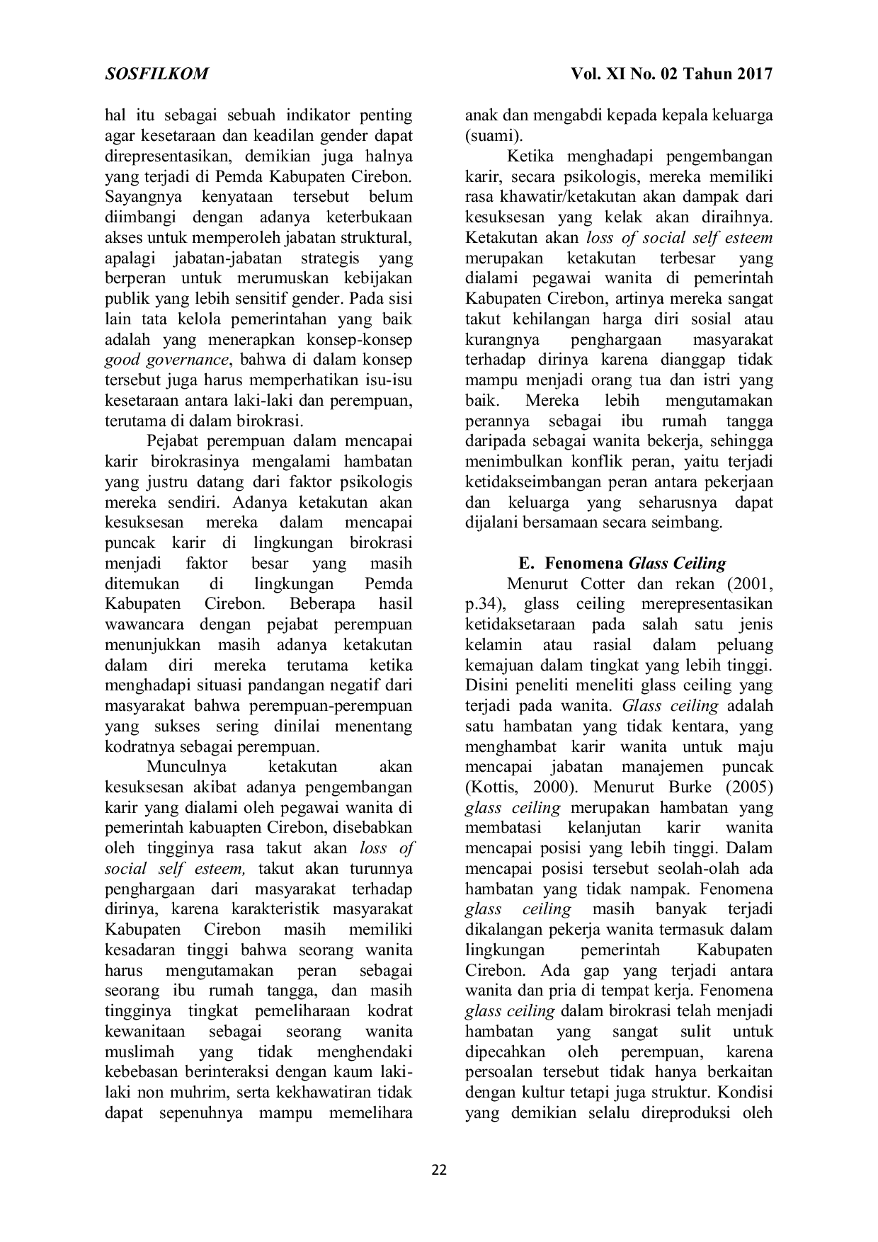 Pengembangan karir bagi pegawai perempuan di pemerintahan Kabupaten Cirebon ternyata memiliki beberapa hambatan diantaranya menimbulkan ketakutan akan kesuksesan dan konflik pekerjaan-keluarga yang berdampak pada menurunnya prestasi kerja, maka sebaiknya dalam penentuan posisi kerja, pegawai wanita ditempatkan di lingkungan kerja yang tidak menuntut pertambahan waktu kerja (kerja lembur), sehingga tidak mengurangi kewajibannya sebagai ibu rumah tangga.Pegawai perempuan dalam mencapai karirnya menghadapi konflik pekerjaan-keluarga, dapat mempengaruhi kerjanya.Pencapaian karir pegawai perempuan seringkali terhambat oleh adanya konflik pekerjaan-keluarga serta adanya stereotip jenis peran membuat pegawai wanita kurang kompetitif dibanding pria.Hal tersebut terjadi karena adanya perasaan takut sukses yang dimiliki pegawai wanita serta menimbulkan konsekuensi sosial yang negatif yang akan diterima, seperti kehilangan feminitasnya, popularitas, tidak mendapat dukungan sosial dan dikucilkan di tempat kerja.Fenomena glass ceiling masih banyak terjadi dikalangan pekerja wanita termasuk dalam lingkungan pemerintah Kabupaten Cirebon.Ada gap yang terjadi antara wanita dan pria di tempat kerja.Fenomena glass ceiling dalam birokrasi telah menjadi hambatan yang sangat sulit untuk dipecahkan oleh perempuan, karena persoalan tersebut tidak hanya berkaitan dengan kultur tetapi juga struktur.Struktur organisasi yang dibangun oleh pemerintah Kabupaten Cirebon belum berperspektif gender.